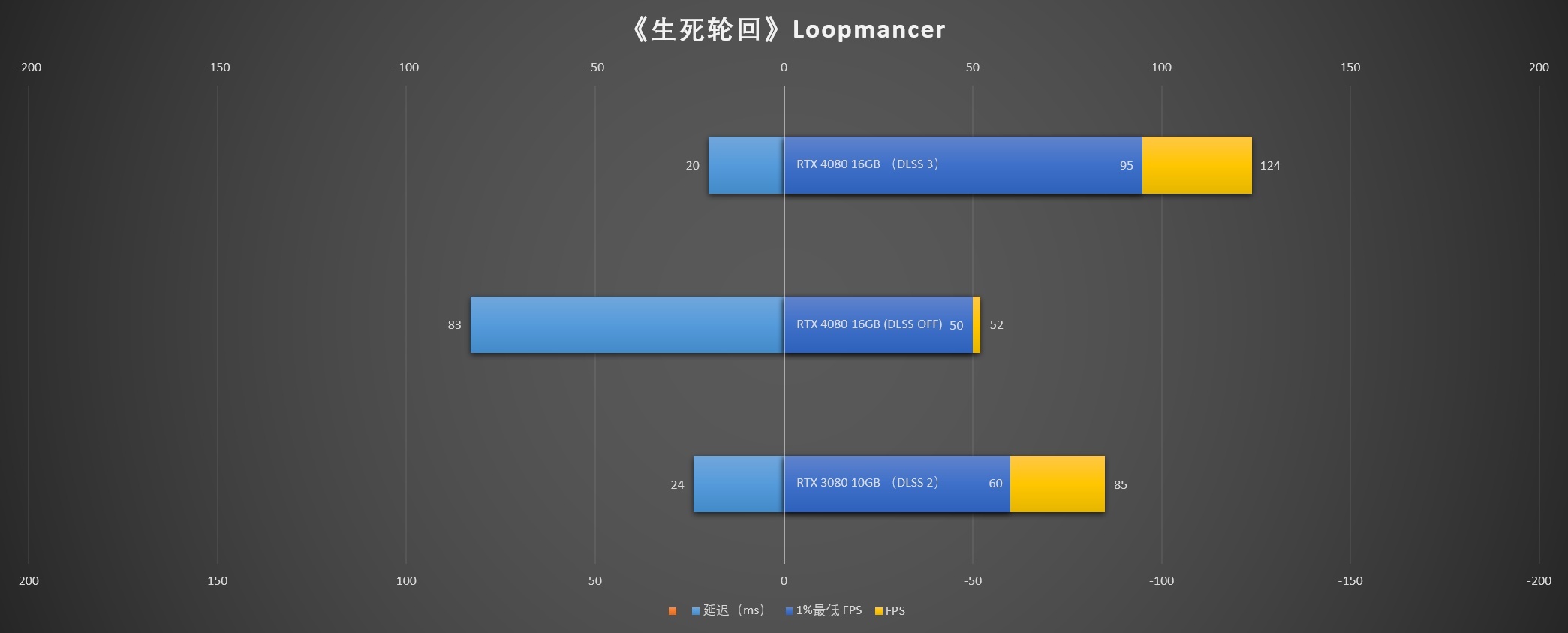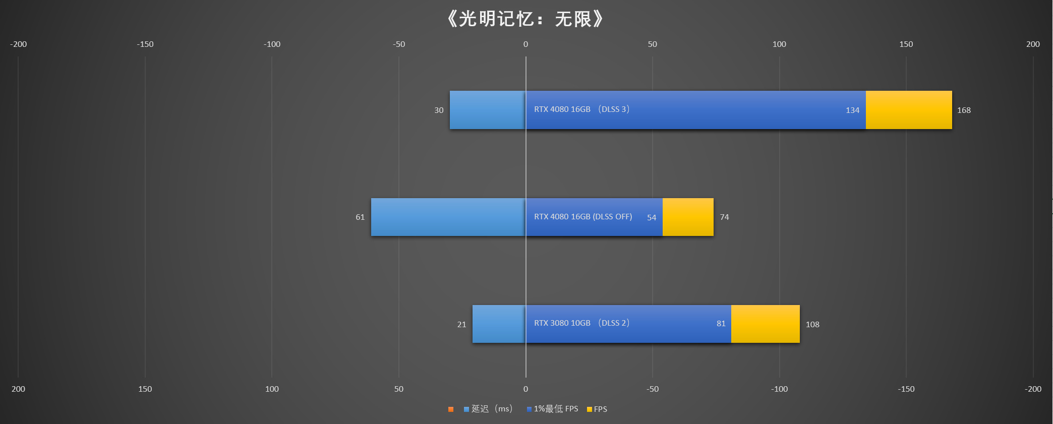 这里的延迟表现可以看到,无论是iGame GeForce RTX 4080 16GB Vulcan OC开启DLSS 3还是RTX 3080 10GB开启DLSS 2,其延迟都降低到了20ms-24ms,大约是未开启DLSS时的四分之一,可见DLSS对提升竞技游戏与动作游戏的体验有十分重要的作用。
