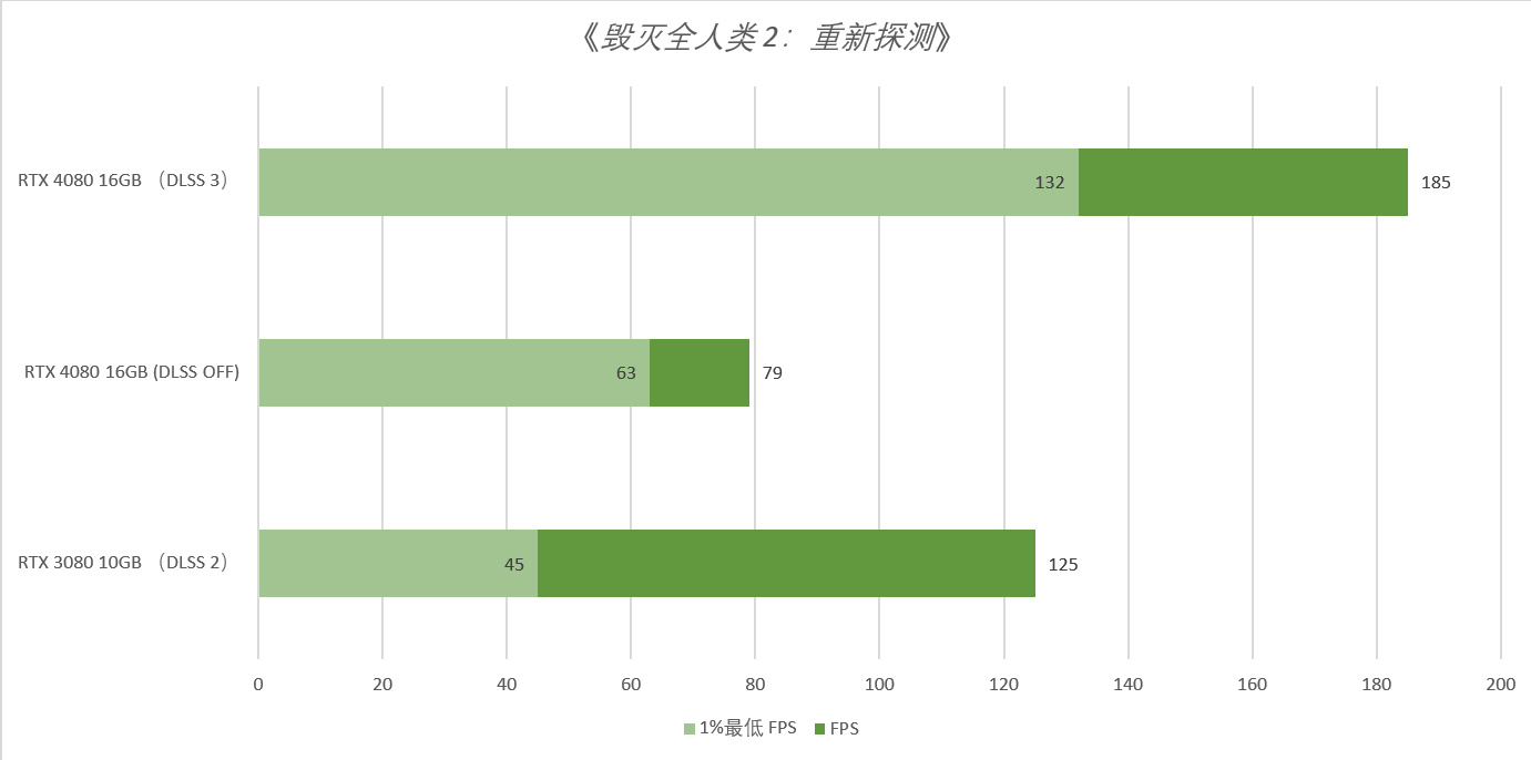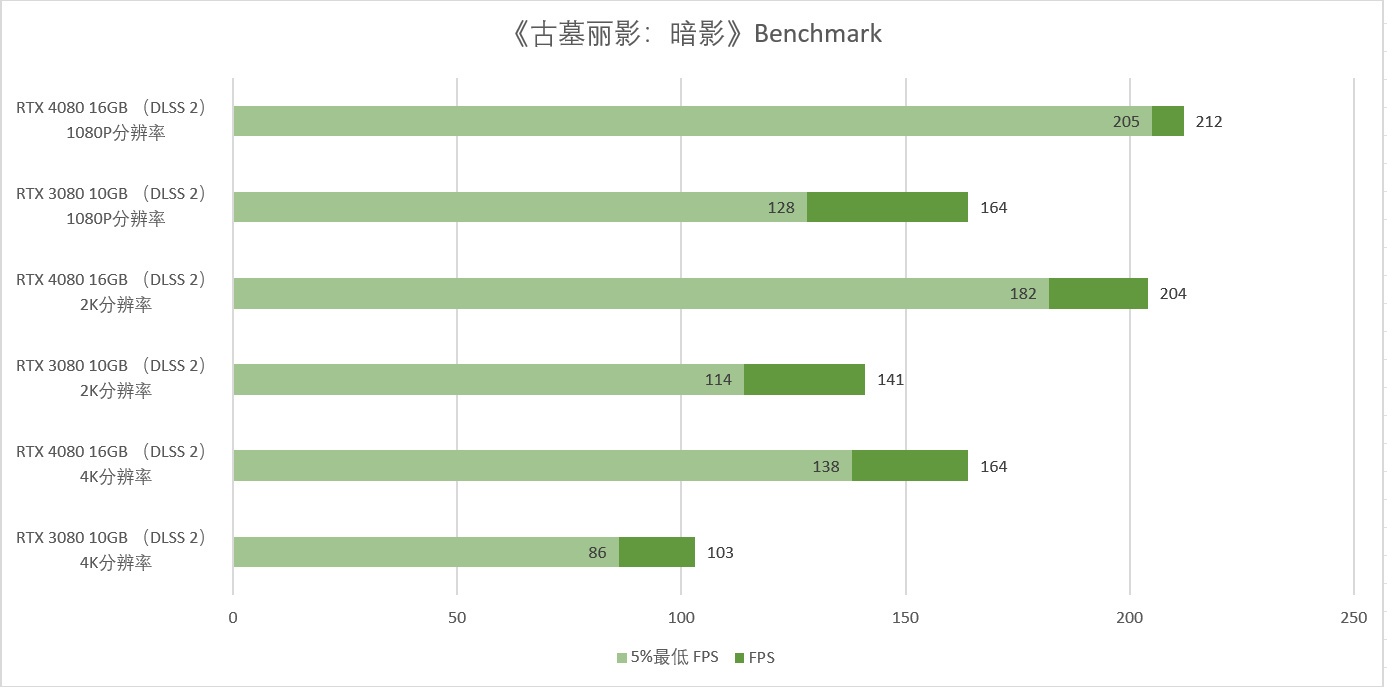 同时,RTX 3080 10GB在开启DLSS 2后的平均帧率与1% Low 帧率分别为110 PFS与50FPS,两者相差很大,也就是说帧率并不稳定。同时,RTX 4080 16GB的平均帧率是RTX 3080 10GB平均帧率的1.75倍。