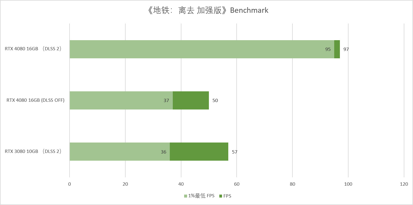 ▲《地铁:离去》是全球首款支持RTX光线追踪的游戏,由4A Games开发,因为其自带功能选项非常齐全的BenchMark,成为了众多装机爱好者们必备的跑分神器。其更新后的加强版支持全新光线追踪技术与DLSS 2.0,是一个很不错的跑分游戏,这里用它便是为了测试两款显卡在DLSS 2下的表现。