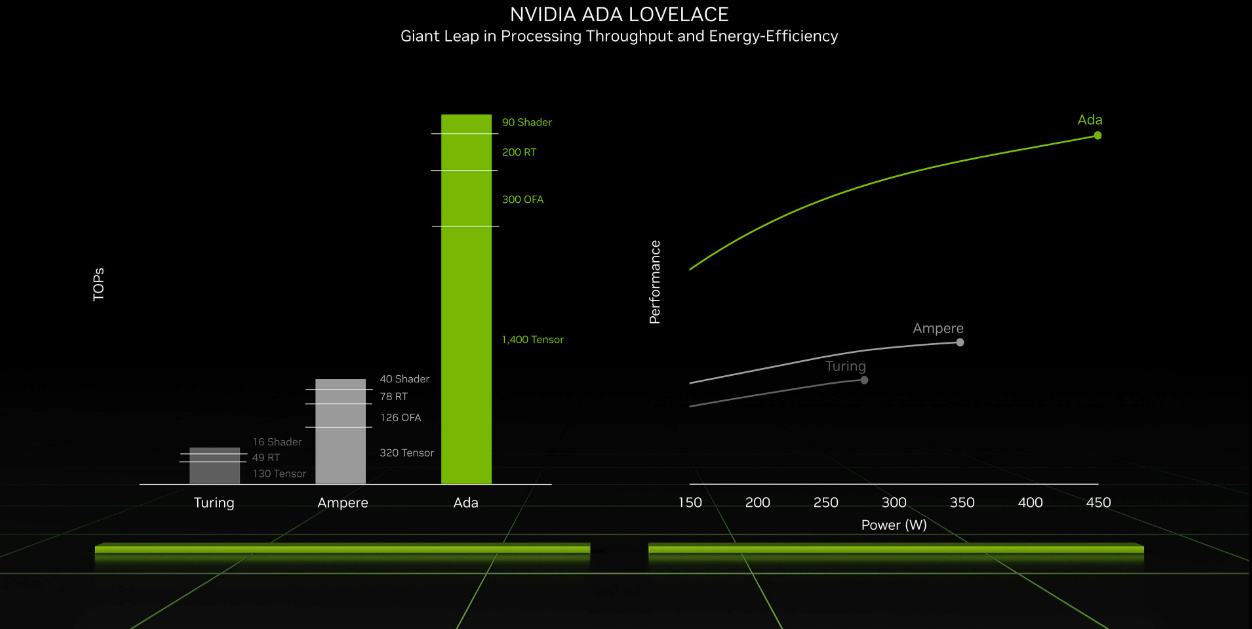 ▲最后,在能效比方面,Ada 架构的效率也令人感到不可思议:在相同的功率下,其性能相较安培架构最高可达两倍以上;增大功率,性能还能持续提升。
