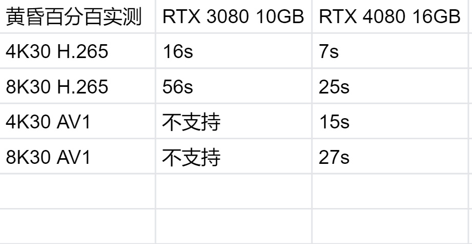 ▲英伟达提供了4K、8K的RAW格式视频各一个,我将通过达芬奇 DaVinci Resolve对其进行剪辑,输出一个1分钟的视频,编码格式分别为AV1与H265,我们将比较两款显卡在H265输出的效率,以及RTX 4080 16GB在AV1编码下的效率(RTX 3080 10GB并不支持AV1编码)。