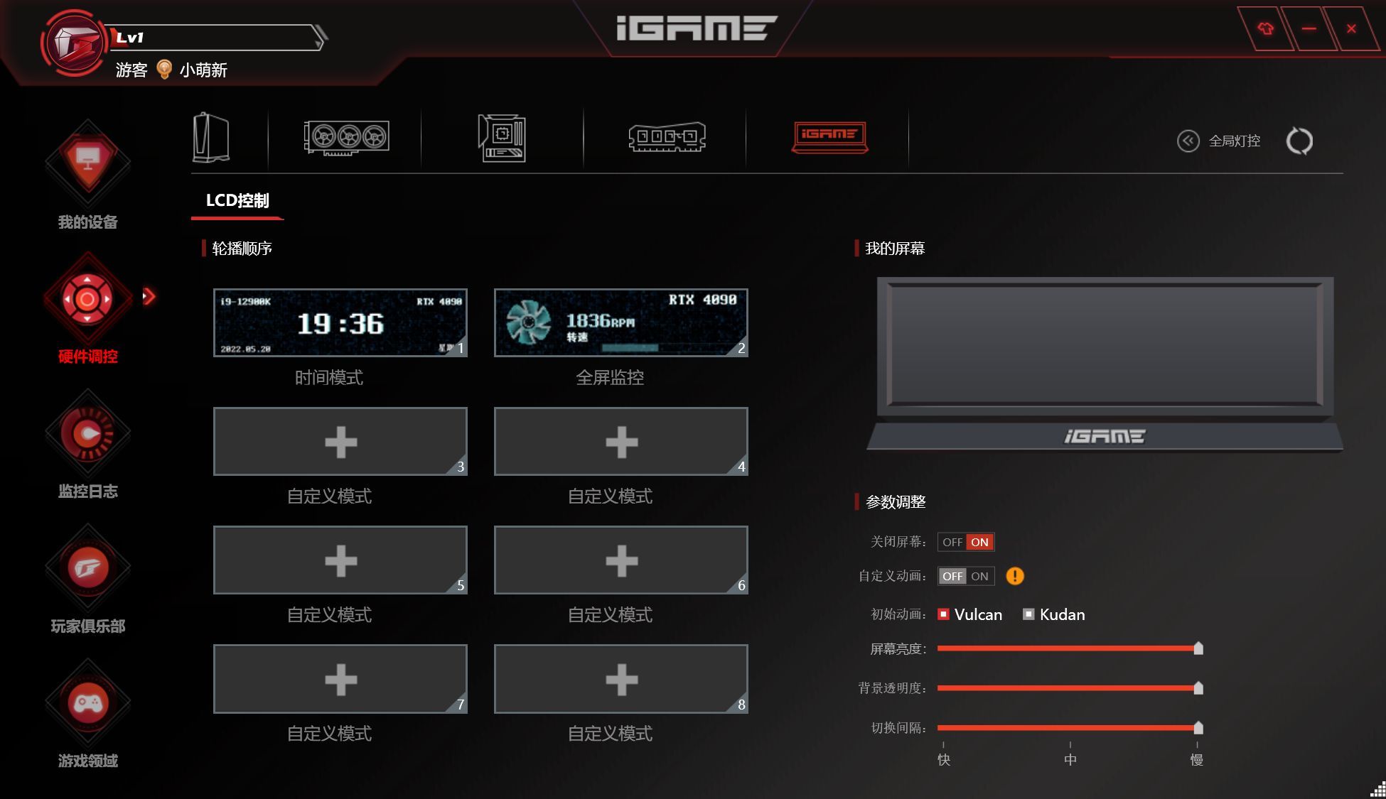 ▲通过全新的iGame Center软件,不仅可以调整硬件灯效,快捷的进行硬件超频,还可以为Vulcan系列显卡(包括之前几代Vulcan火神显卡)的LCD屏定制输出图案,且不只是静态图片,gif动图同样可以完美显示,之前我在RTX 3080Ti首发测评时做了动图,本次实在是没有时间,争取下一次再补上。