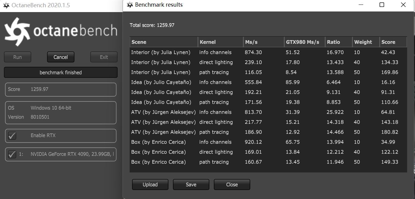 ▲附:iGame GeForce RTX 4090 Neptune OC的OctaneBench得分为1259.97分。