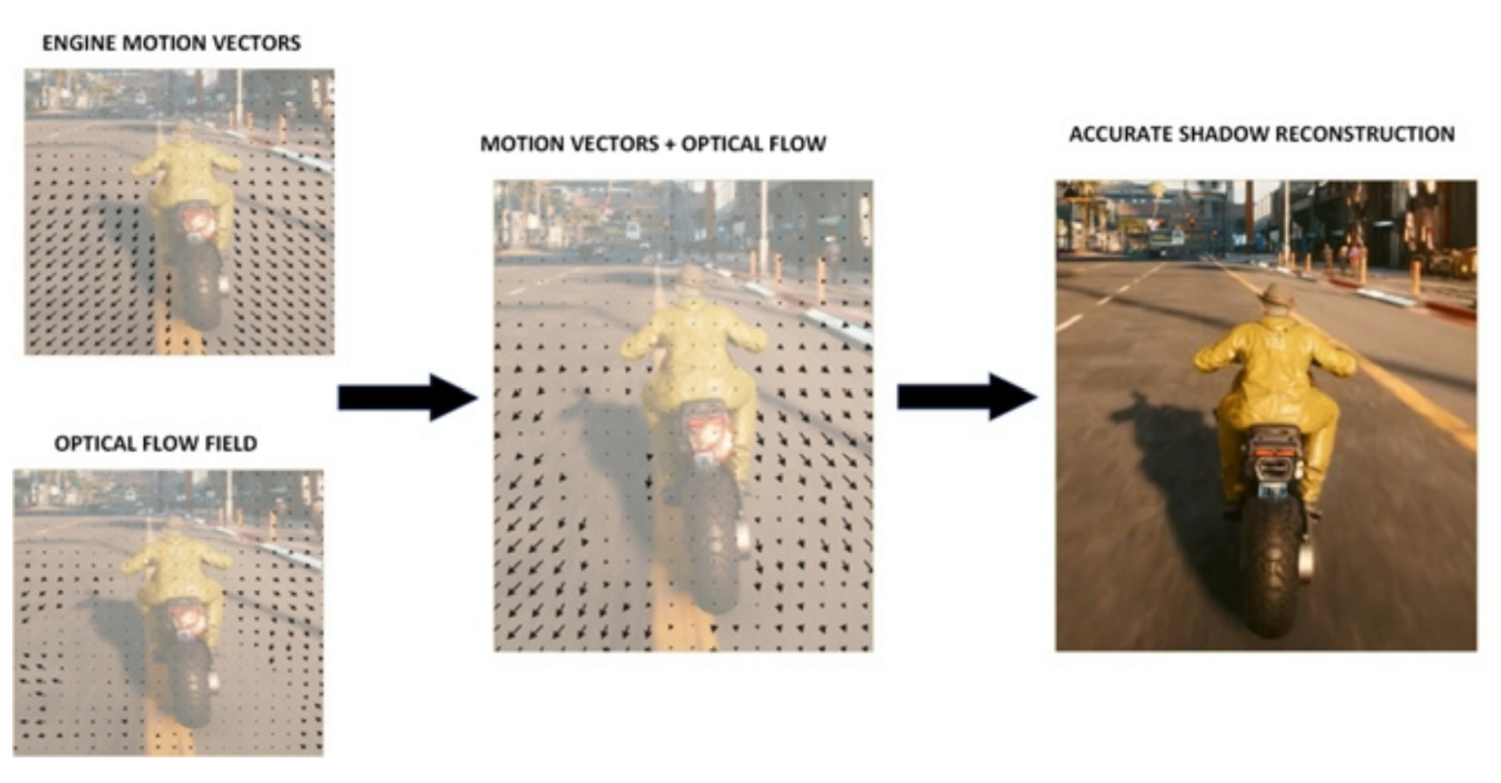 ▲这里便要说,电视因为其不参与画面渲染的过程,所以只能够通过算法与预测中间帧应该显示的画面,难免在阴影方面出现不准确的情况,导致插帧后画面不自然。而英伟达显卡的DLSS 潜在帧生成技术因为是在渲染过程中在光流加速器中发生的,所以可以获得准确的运动矢量(MOTION VECTORS),所以可以准确预测出中间画面所处的状态, 自然画面阴影效果就十分准确了。同时,生成的帧不需要CPU提供数据,因此整体帧率可以超过CPU渲染的帧率限制,大幅降低了对CPU性能的要求。