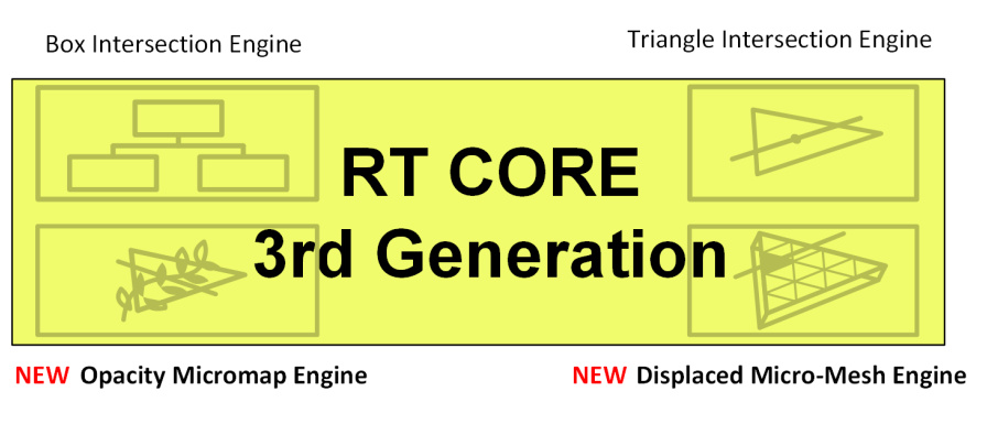 ▲紧接着我们再说一下第三代RT CORE新搭载的两款引擎,除了在安培架构中已经使用的Box Intersection Engine与Triangle Intersection Engine两款引擎。Ada架构搭载的新款 RT CORE 还配备全新 Opacity Micromap (OMM) 引擎和 Displaced Micro-Mesh (DMM) 引擎。