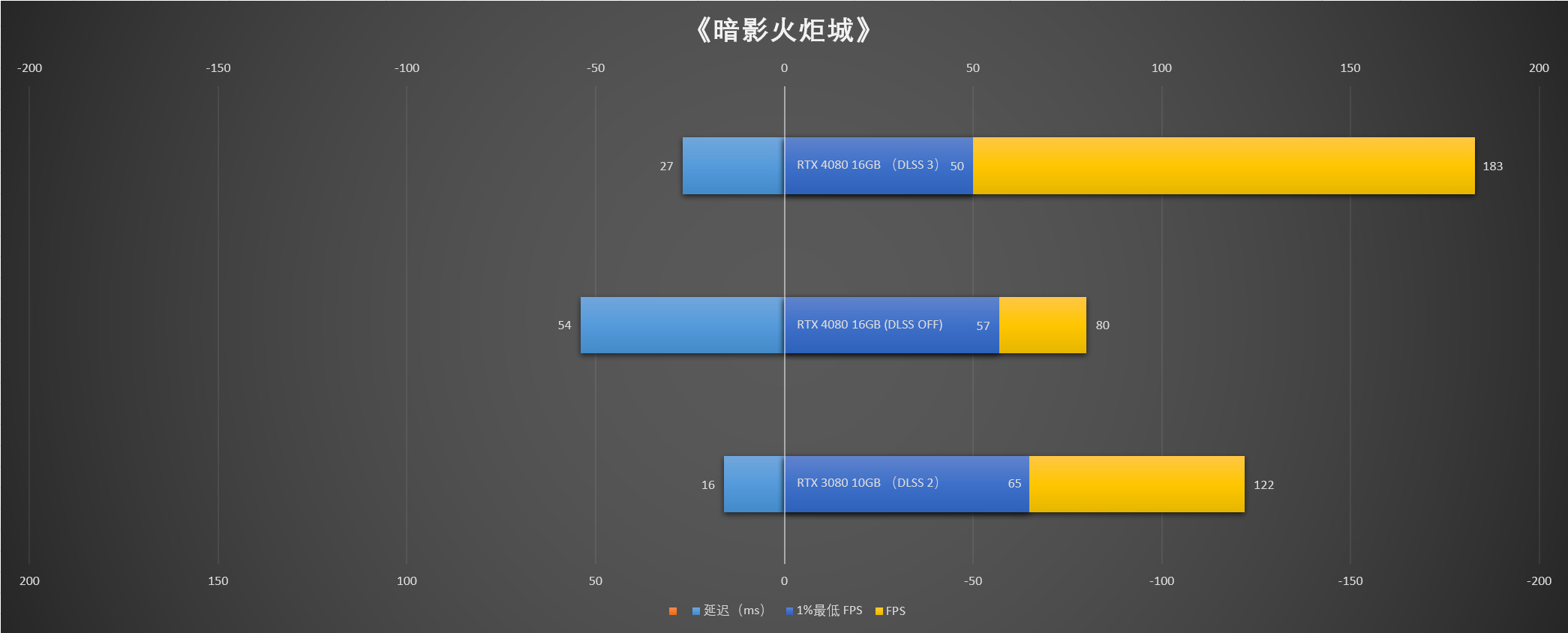 开启DLSS 3后,iGame GeForce RTX 4080 16GB Vulcan OC的平均帧率上升到了183 FPS,为50 FPS,延迟则降低到了惊人的27ms。
