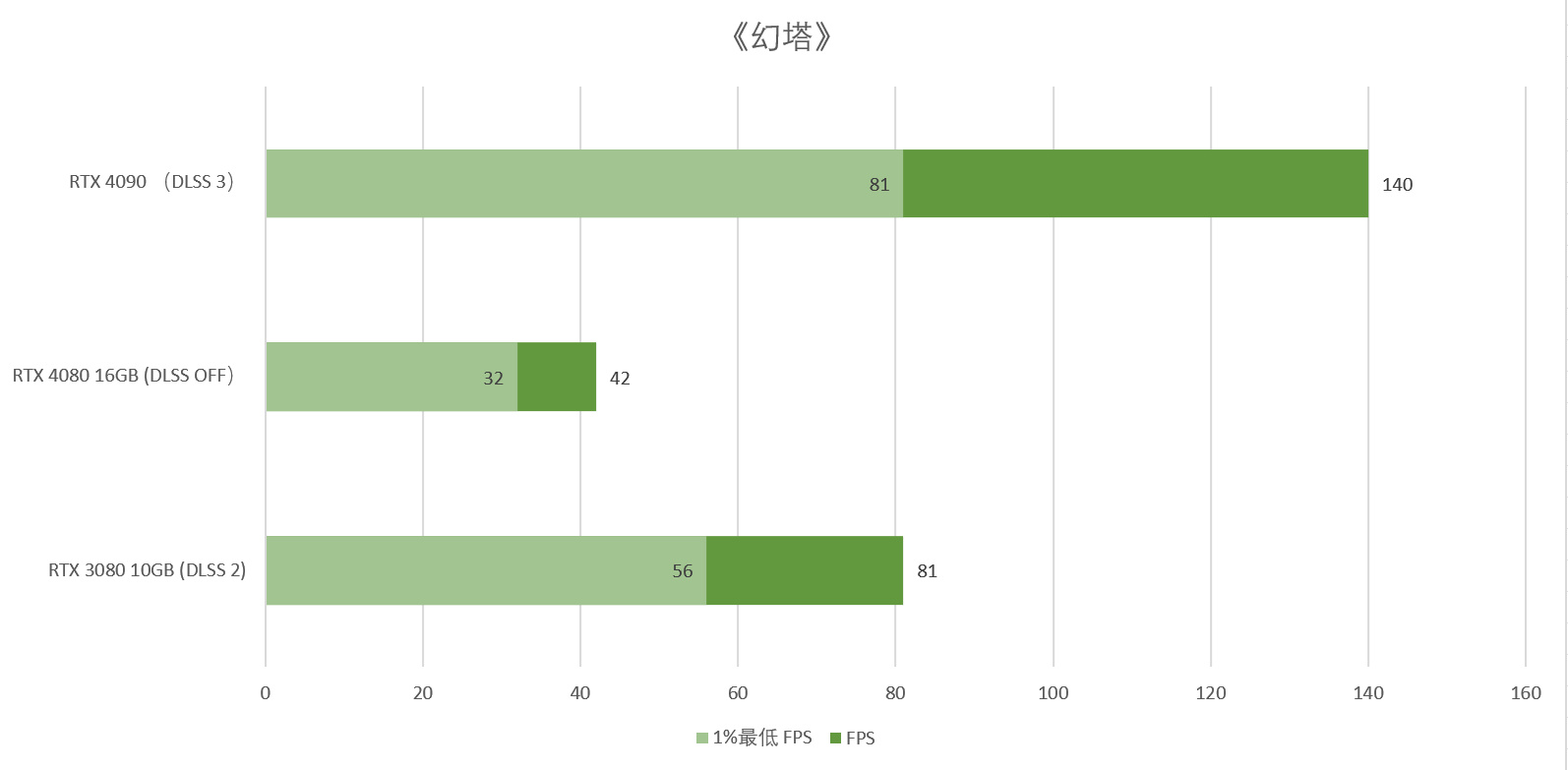 可见,在4K分辨率下,均开启DLSS时,iGame GeForce RTX 4080 16GB Vulcan OC的帧率是RTX 3080 10GB的2倍。