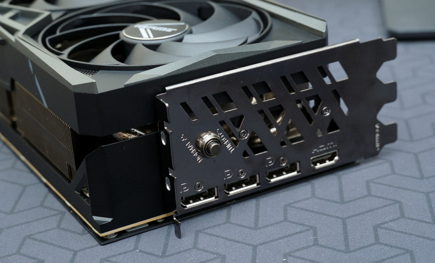 ▲接口方面,依旧是3DP1.4a+1HDMI2.1的配置,另外,一键超频按钮也从RTX 3090Ti起便进行的工艺升级,目前不仅手感更好,而且更不易损坏。