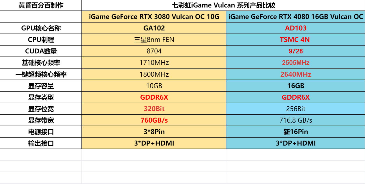 iGame GeForce RTX 4080 16GB Vulcan OC参数对比