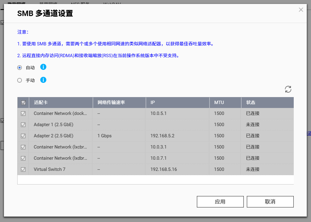 第二,参与多通道的网口必须带宽一致,比如NAS同时有四个2.5G网口和一个万兆网口,那么只有这四个2.5G网口也可以参与SMB多通道传输,无法再加上万兆口达到20Gbps的带宽。
