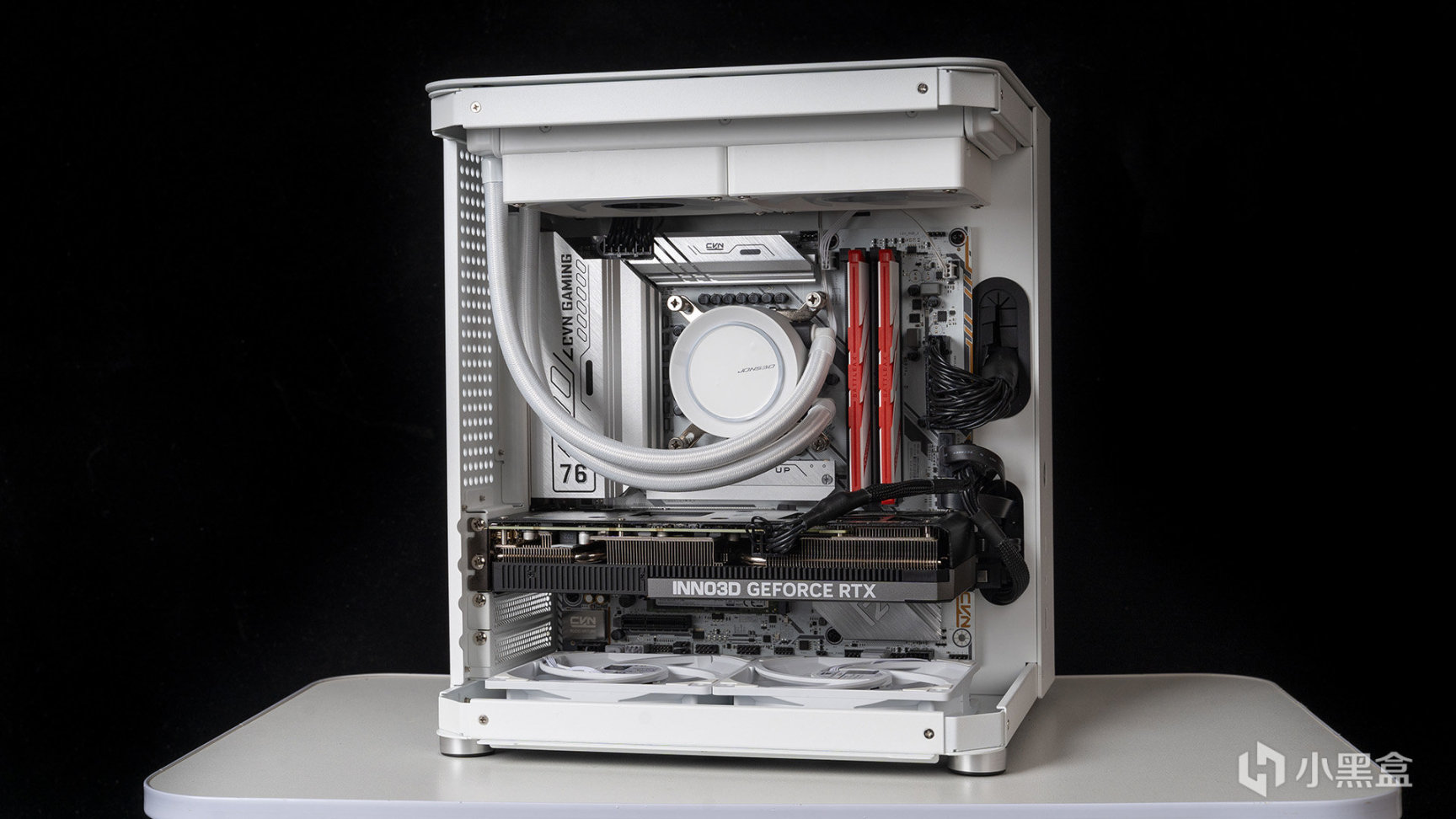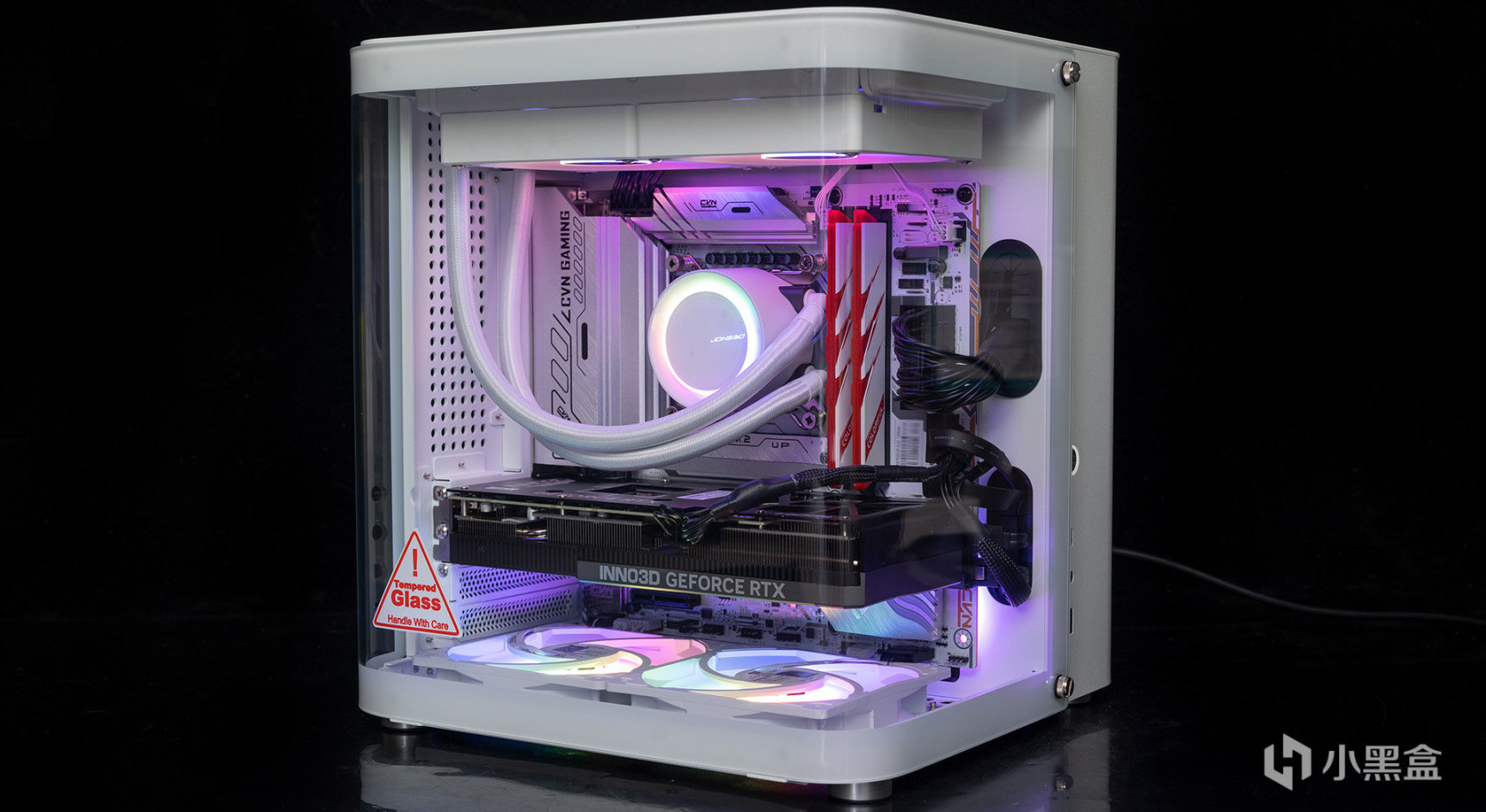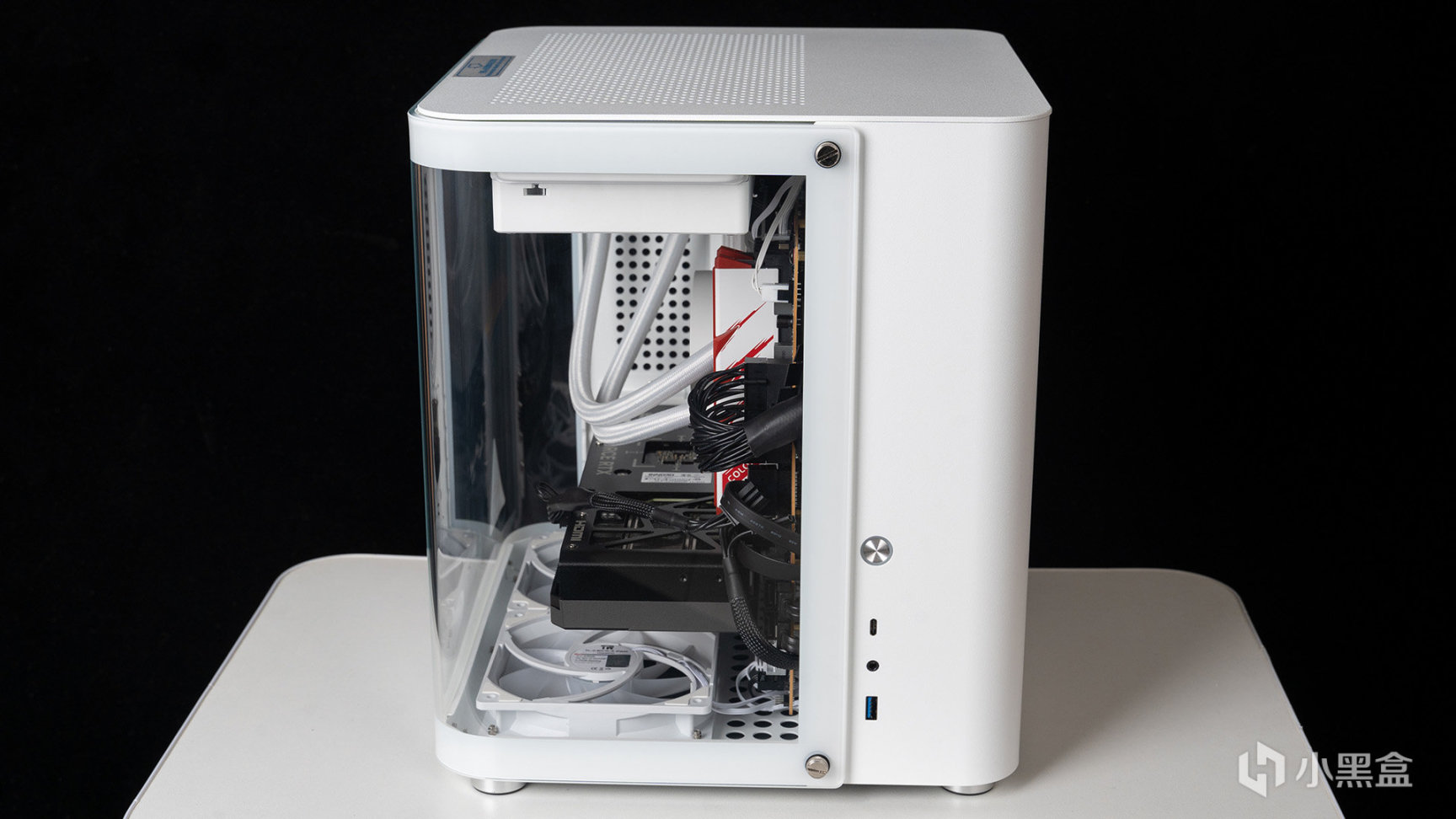 移除玻璃侧透后,可以看到硬件在机箱内部是相当紧凑的,能利用的空间基本上用到了,底部两颗120mm风扇强烈建议安装,这可是机箱唯一进风区域。另外映众这款RTX 4070曜夜是单8pin供电接口设计的,怎么样都不会线材显得累赘,只是需要注意的是,因为机箱底部绕线孔太小,线材切记安装主板前绕好,不然就只能像硬核一样从上面绕了。