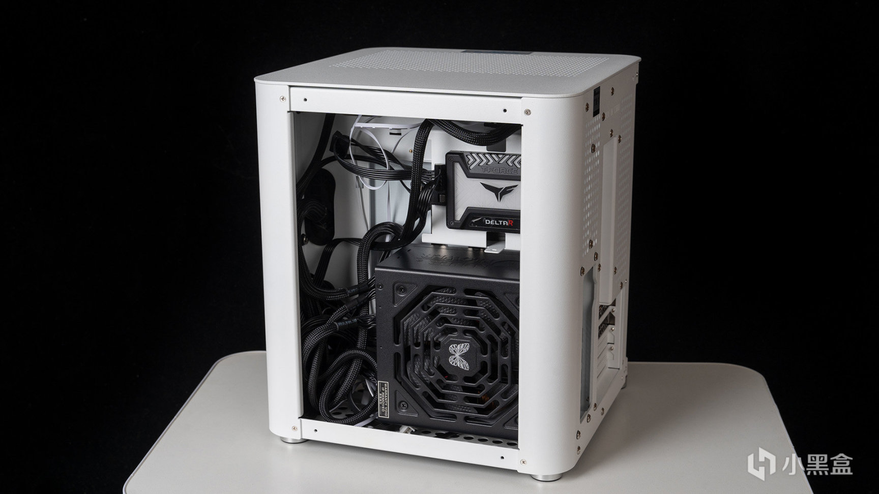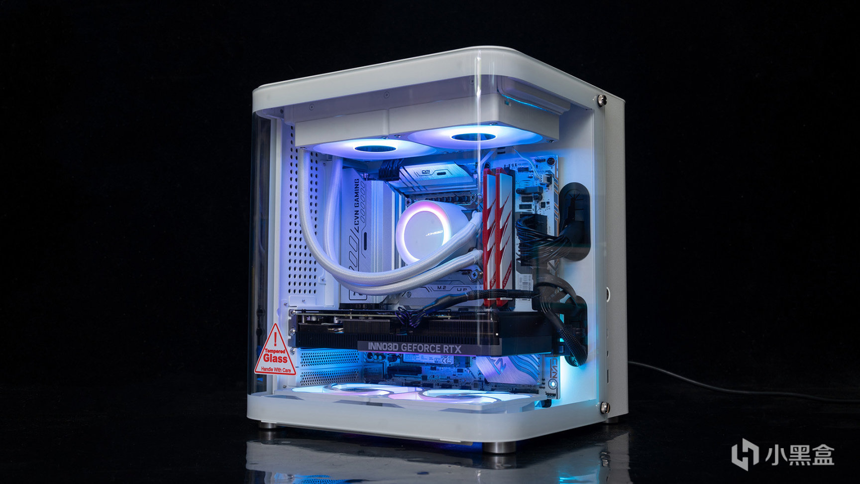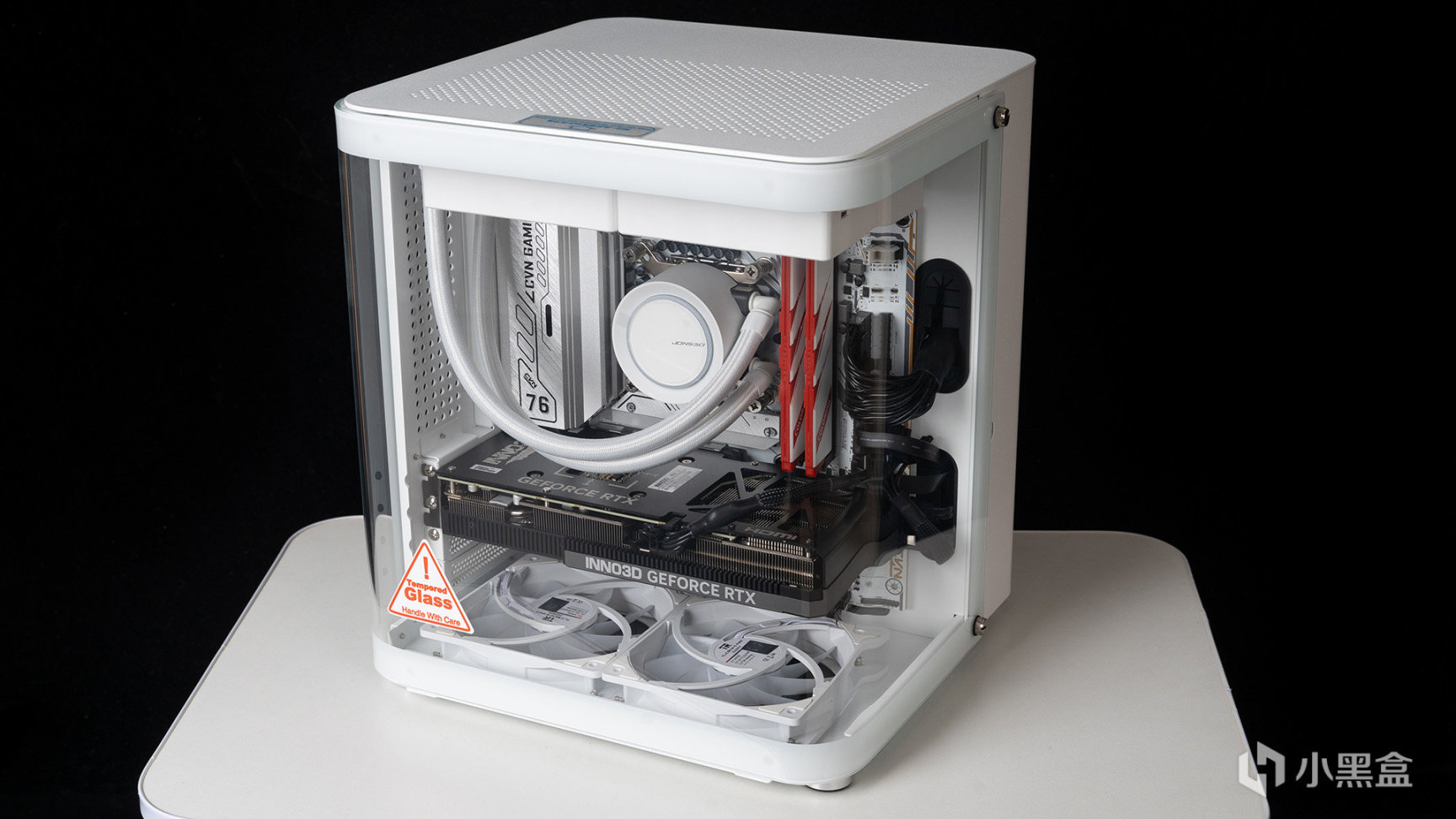 移除玻璃侧透后,可以看到硬件在机箱内部是相当紧凑的,能利用的空间基本上用到了,底部两颗120mm风扇强烈建议安装,这可是机箱唯一进风区域。另外映众这款RTX 4070曜夜是单8pin供电接口设计的,怎么样都不会线材显得累赘,只是需要注意的是,因为机箱底部绕线孔太小,线材切记安装主板前绕好,不然就只能像硬核一样从上面绕了。