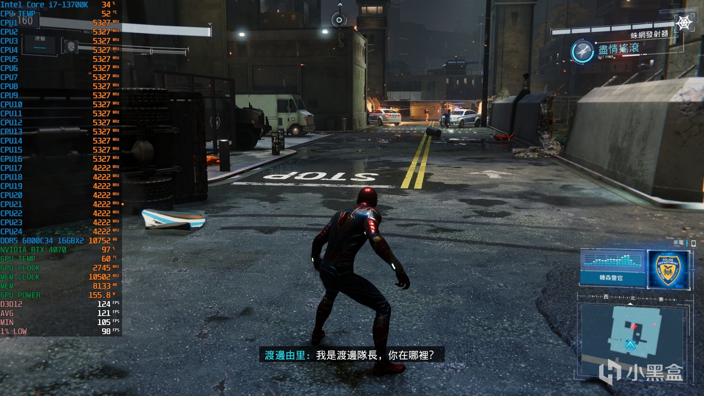 Core i7-13700K+RTX 4070+DDR5 6800C34运行《漫威蜘蛛侠:复刻版》2K预设非常高画质平均帧数为121fps,CPU温度为52℃,显卡温度为60℃