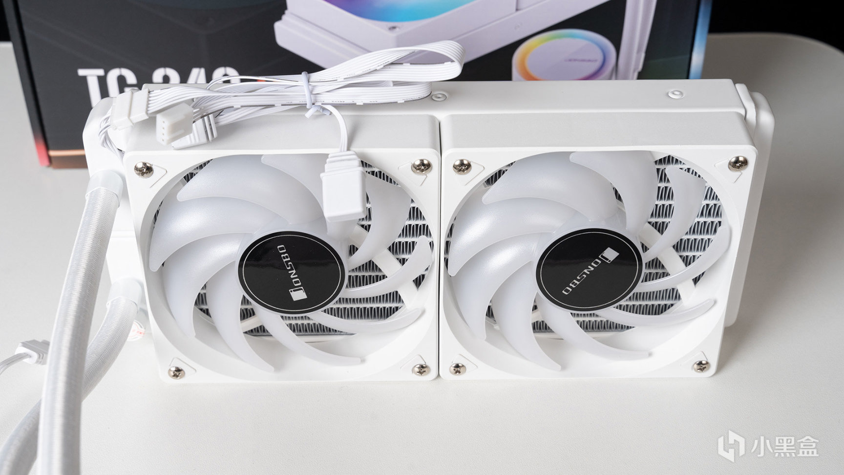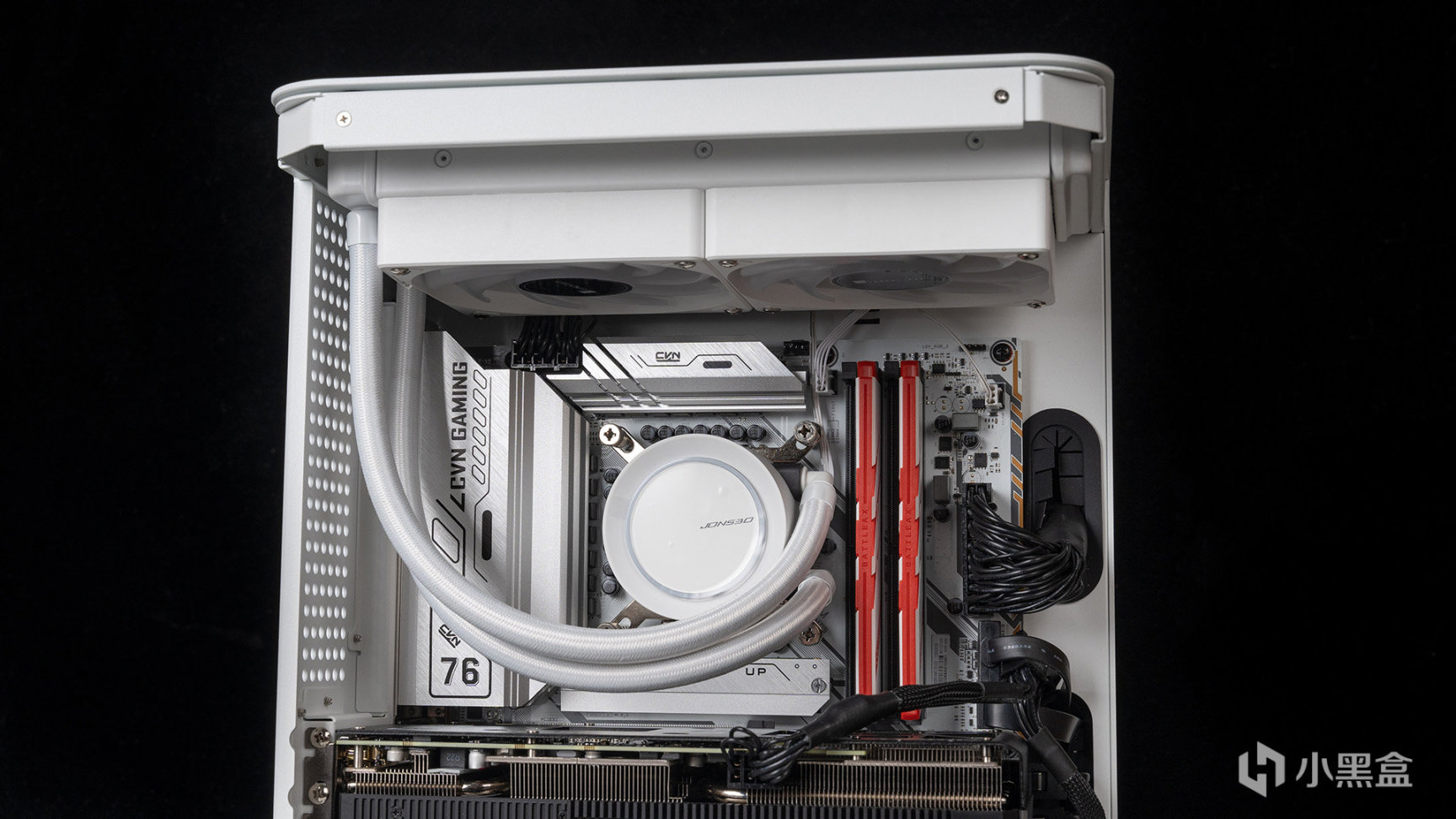 既然机箱风格偏向圆润优雅,那么CPU散热器当然也要对应,选择的也是乔思伯TG-240白色款,冷头和其顶盖也是圆润轮廓的,整体也是白色化覆盖设计。当然,13700K搭配240水冷在极限工况下肯定压不住,至于为什么可以这么组合,后面测试我们再来详解。