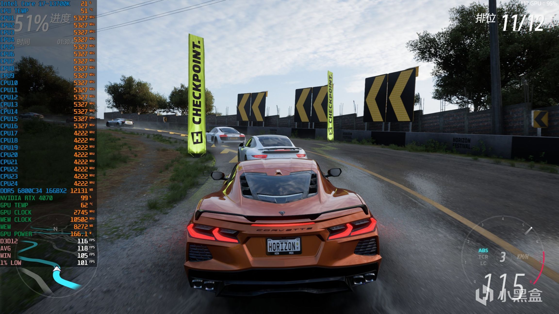 Core i7-13700K+RTX 4070+DDR5 6800C34运行《极限竞速:地平线5》2K预设极端画质平均帧数为118fps,CPU温度为51℃,显卡温度为62℃