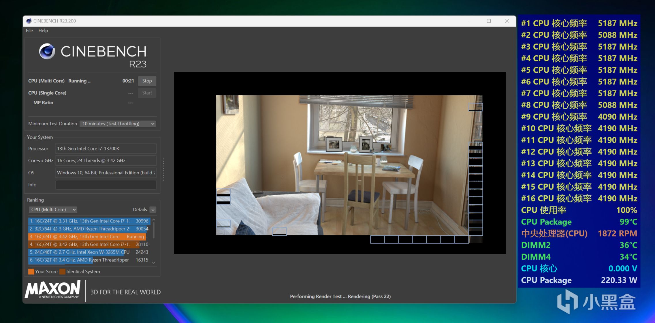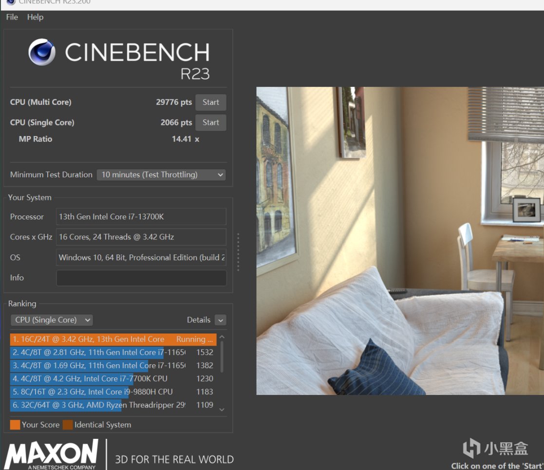 CINEBENCH R23十分钟循环测试,多核跑分为29776 pts,单核跑分为2066 pts,其实相比Z790来说并没有减少很多,多核大概只损失3%左右,而单核则是2%的差异,如果不是很在意CPU温度,B760搭配i7-13700K也没毛病(温度墙会帮你保护CPU),这点性能差距真没太大感知,况且大部分玩家的使用场景95%以上的时间,都绝对没有CINEBENCH R23这种强度。