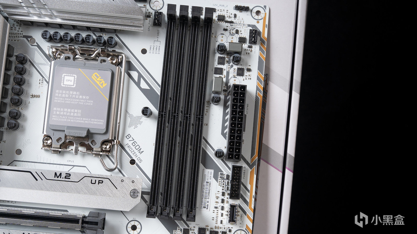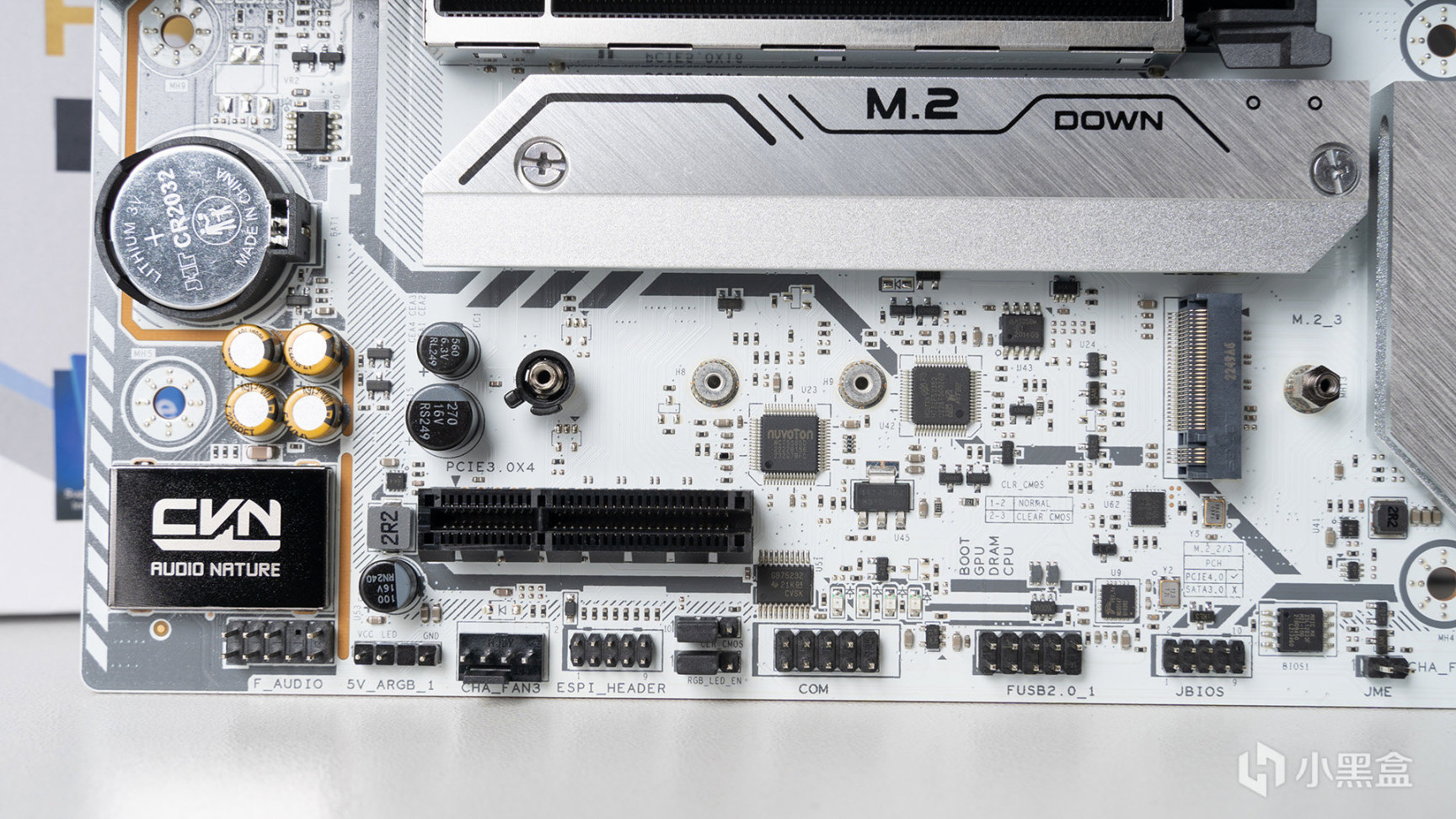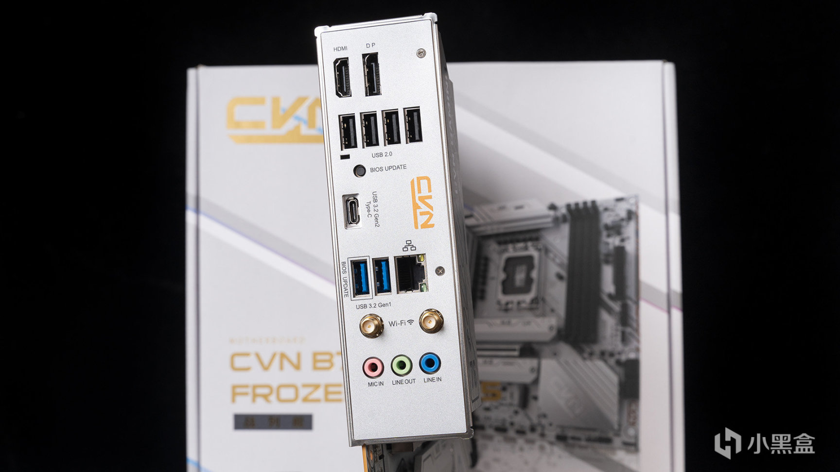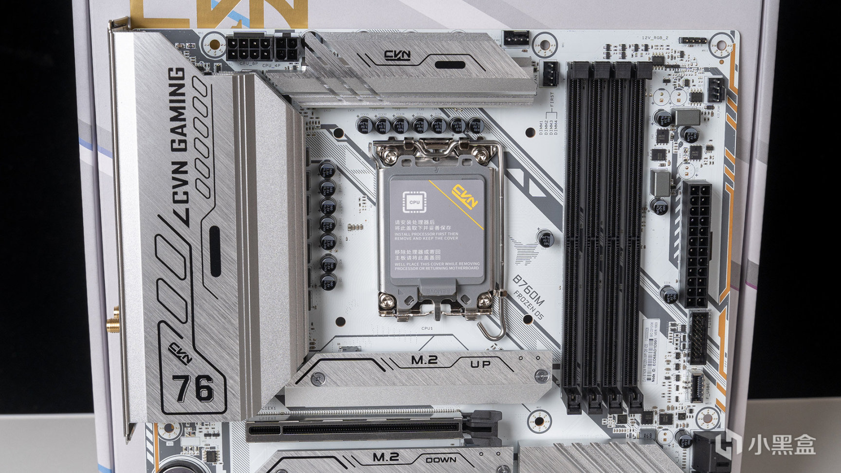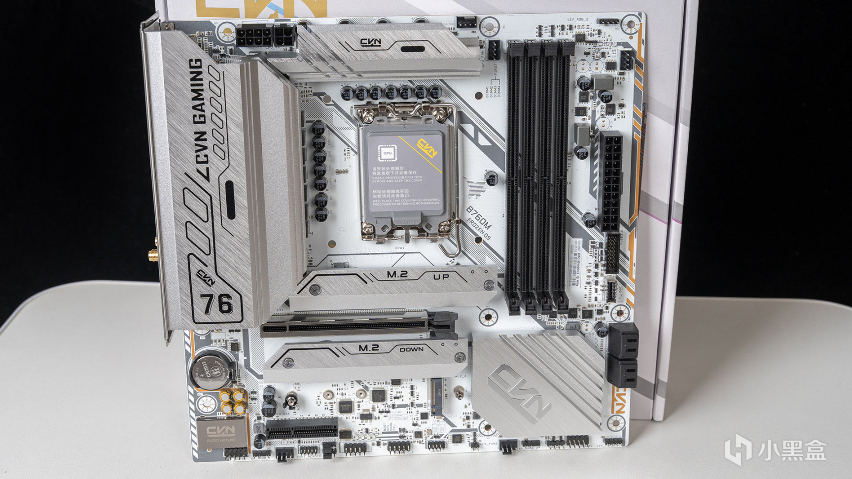 CVN B760M D5外观设计第一眼看上去就觉得惊艳,作为白色向MATX主板,它能把主色覆盖到彻底——采用罕见的白色PCB,制造工艺比常规PCB更为复杂,七彩虹在如今B760Z790产品线覆盖了多款白色PCB主板还是挺良心的。而在寒霜散热装甲方面采用了银色+金属拉丝处理,整体银+白的视觉效果显然比普通白色主板更棒。