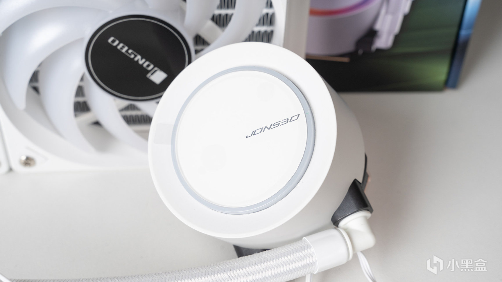 水冷头上有一个可自由旋转的JONSBO LOGO铭牌,呈现的效果挺符合机箱格调,有一定阻尼就是手感比较拉跨。