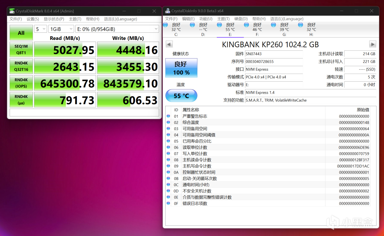 CrystalDiskMark峰值性能测试,金百达KP260 1TB的连续读取速度为5027.95 MB/s,连续写入速度为4448.16 MB/s,表现基本能达到和官方标称,4K随机读写IOPS读写速度分别达到645K IOPS和843K IOPS,属于入门级PCIe4.0 SSD偏上水平。而在跑分期间还顺带记录了SSD的温度,最高只有55℃,在寒霜散热片之下很凉快!