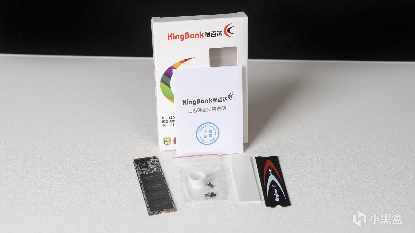 固态配件一览,包括SSD本体、散热片、导热垫、说明书、螺丝和橡皮筋条(用于加强固定住导热垫),提供的散热片出厂是分离的,选择权交还给用户,除此之外散热片非常薄,可适用于笔记本、PS5这些狭窄使用环境。