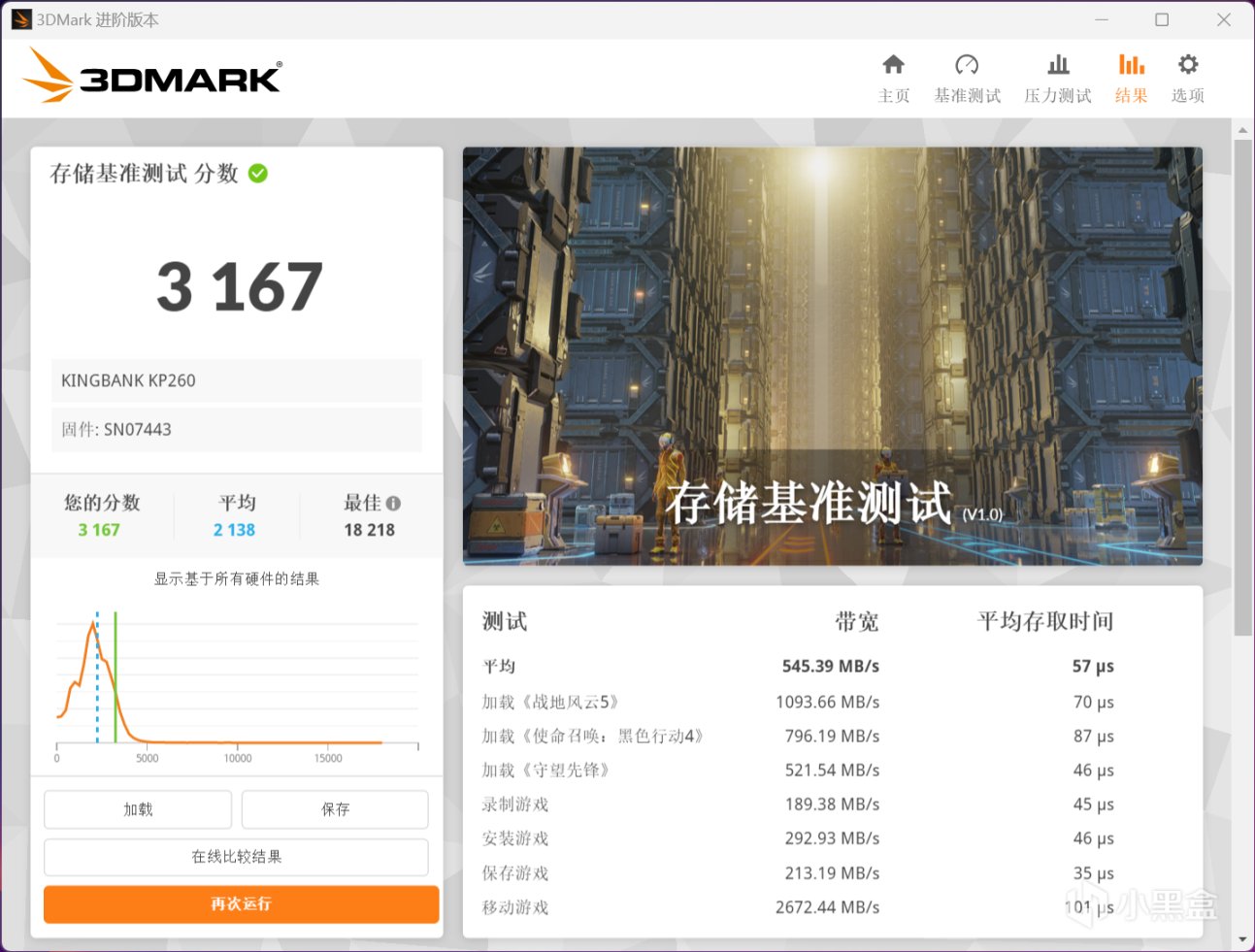 再来看下金百达KP260 1TB的表现,3DMark存储基准测试项目,最终得分为3167,平均传输带宽为545.39 MB/s,平均存储时间57us,属于主流PCIe 4.0产品水平没毛病。