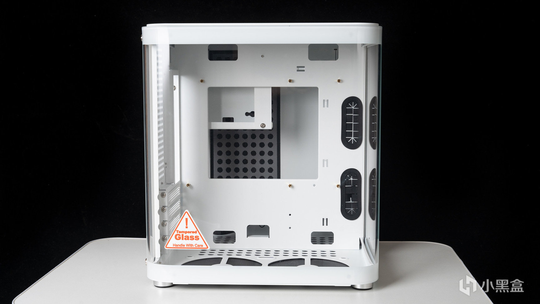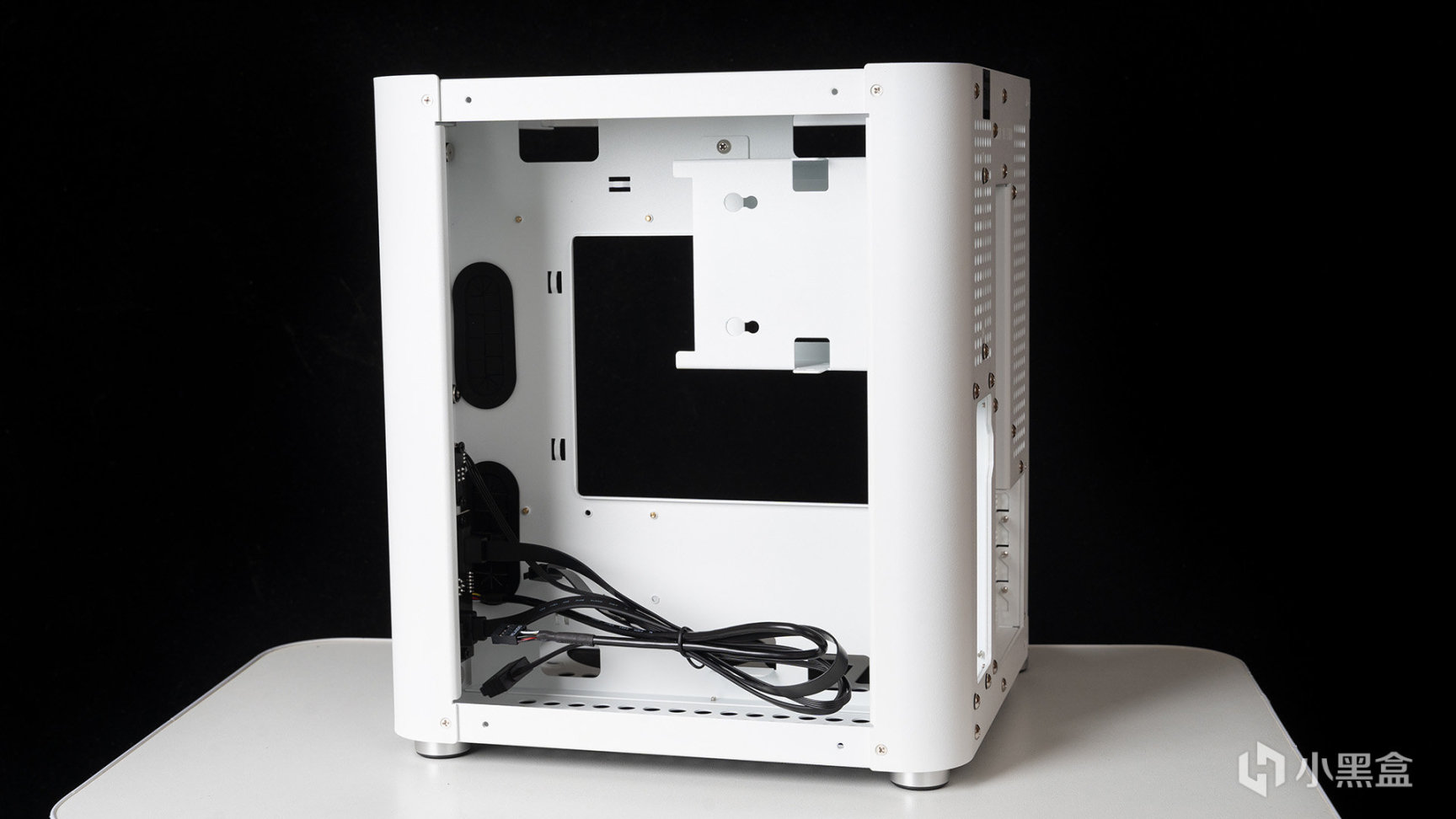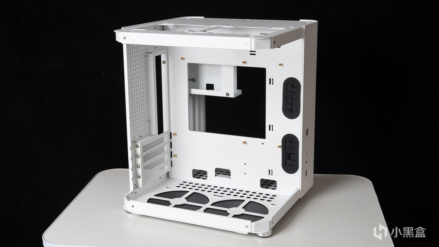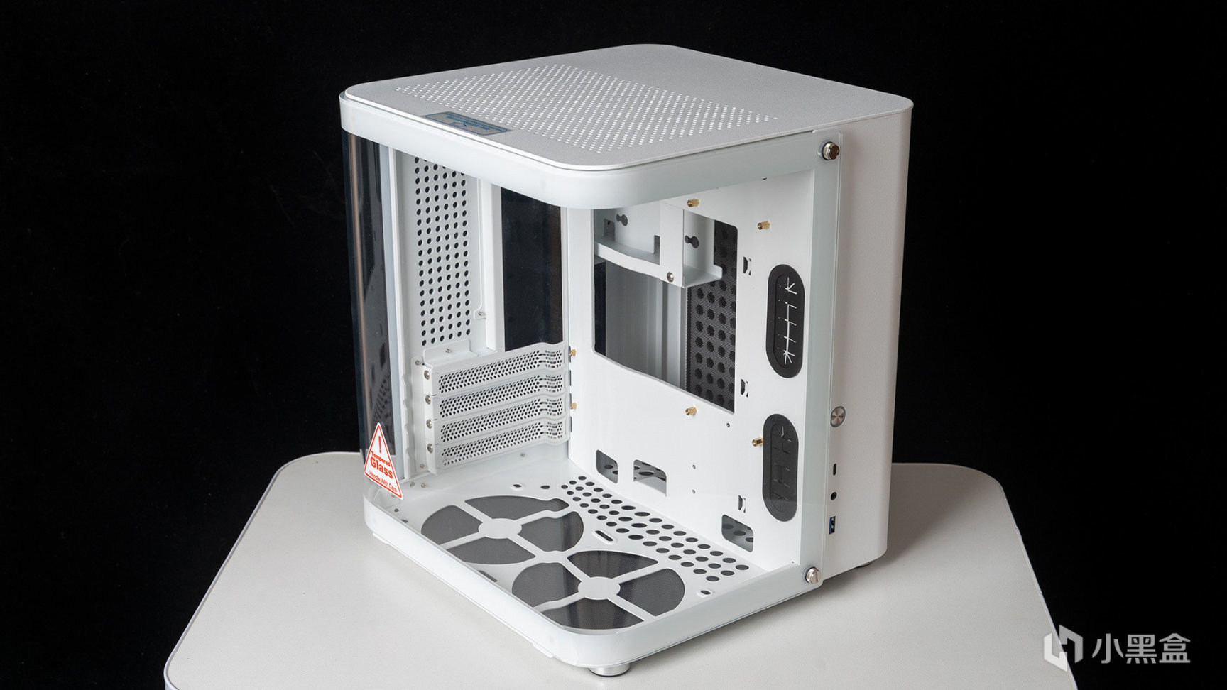 移除钢化玻璃侧透和面板之后就能看到机箱内部结构了,很显然这是一个M-ATX经典结构——能最大程度保留扩展性,但是显然设计权重还是偏向外观,为了保持圆润方正的轮廓,机箱本身长度限制在310mm,所以显卡最长支持到280mm个人觉得已经很极限,对于入门级的三风扇非公来说刚刚够。底部支持两颗120mm风扇安装直吹显卡,顶部支持240mm冷排,对于中高端以下的配置挺合适的。