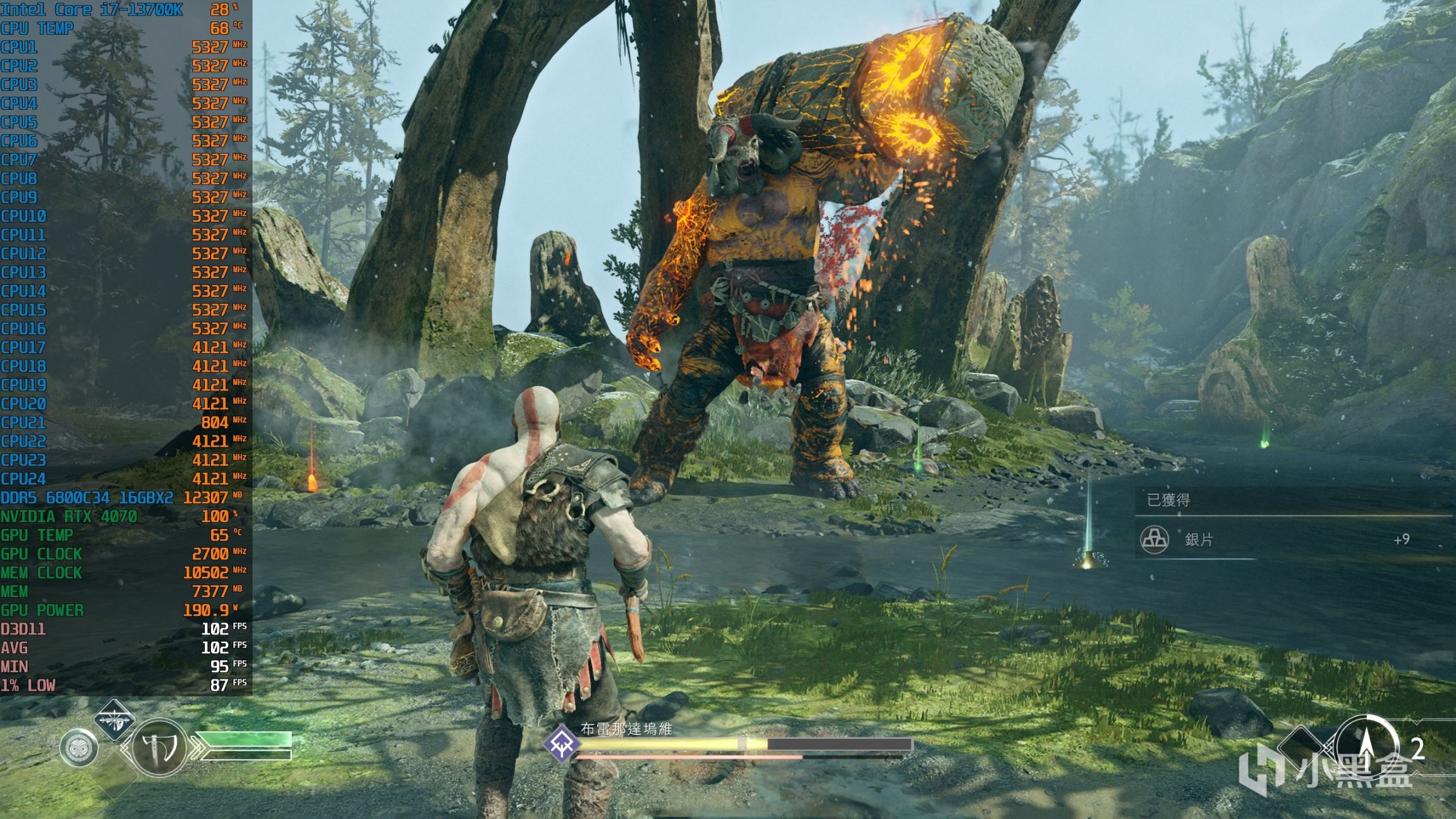 Core i7-13700K+RTX 4070+DDR5 6800C34运行《战神4》2K预设超高画质平均帧数为102fps,CPU温度为68℃,显卡温度为65℃