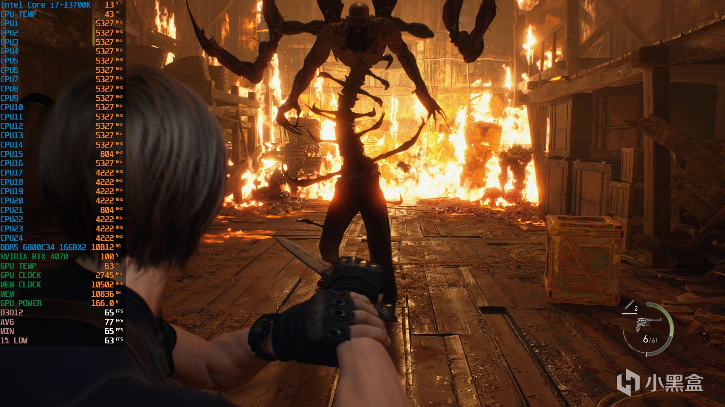 Core i7-13700K+RTX 4070+DDR5 6800C34运行《生化危机4:重制版》2K预设最高画质(含光追)平均帧数为77fps,CPU温度为43℃,显卡温度为63℃