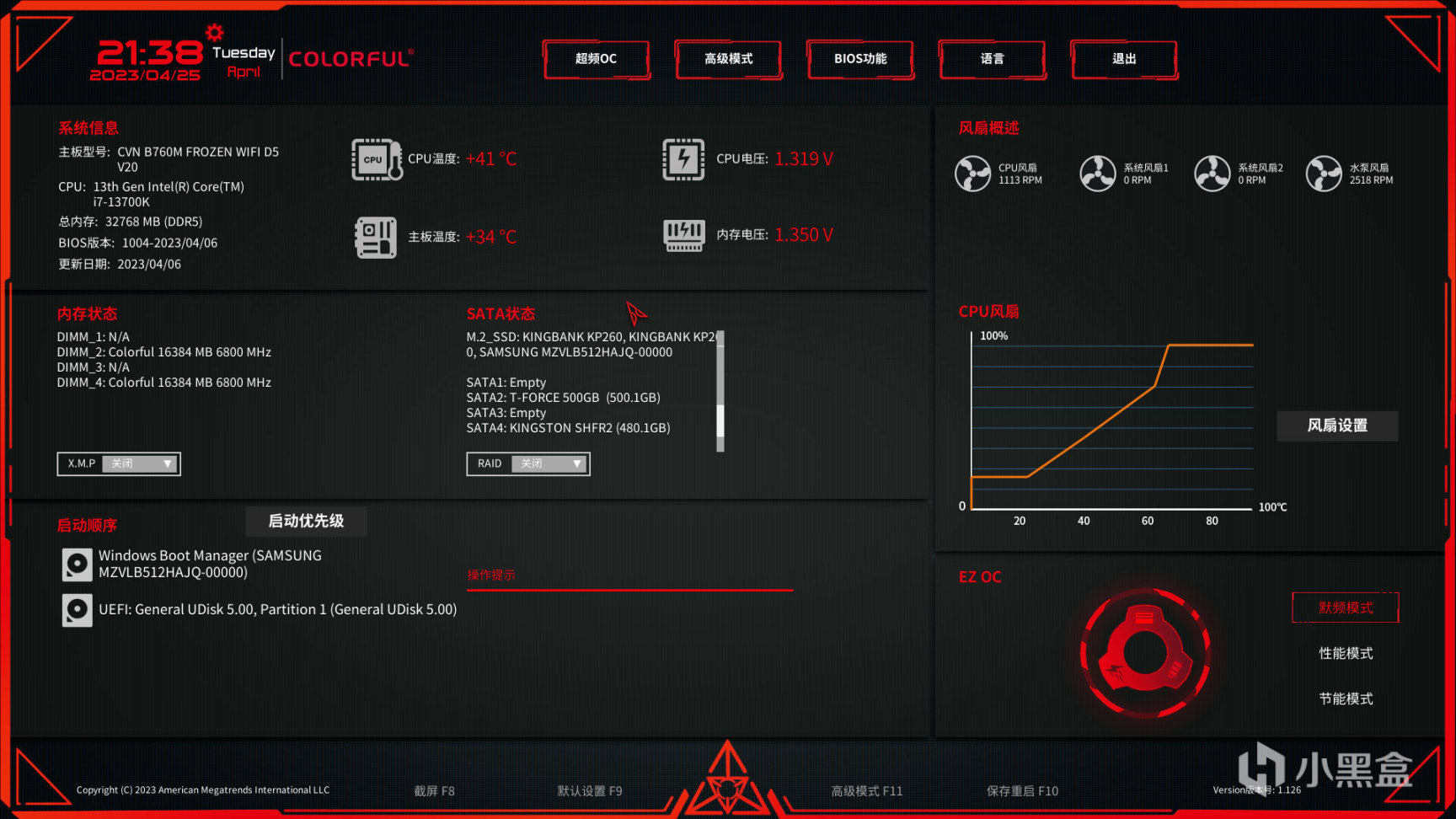正式测试之前先体验一下CVN B760M D5这款主板的BIOS,进入后映入眼帘的是简易模式界面,像大多数主流B760采用了分区式设计,包括系统信息、内存(XMP开启)、风扇设置、启动顺序等常用调节选项都有设置,达到预期所想了。