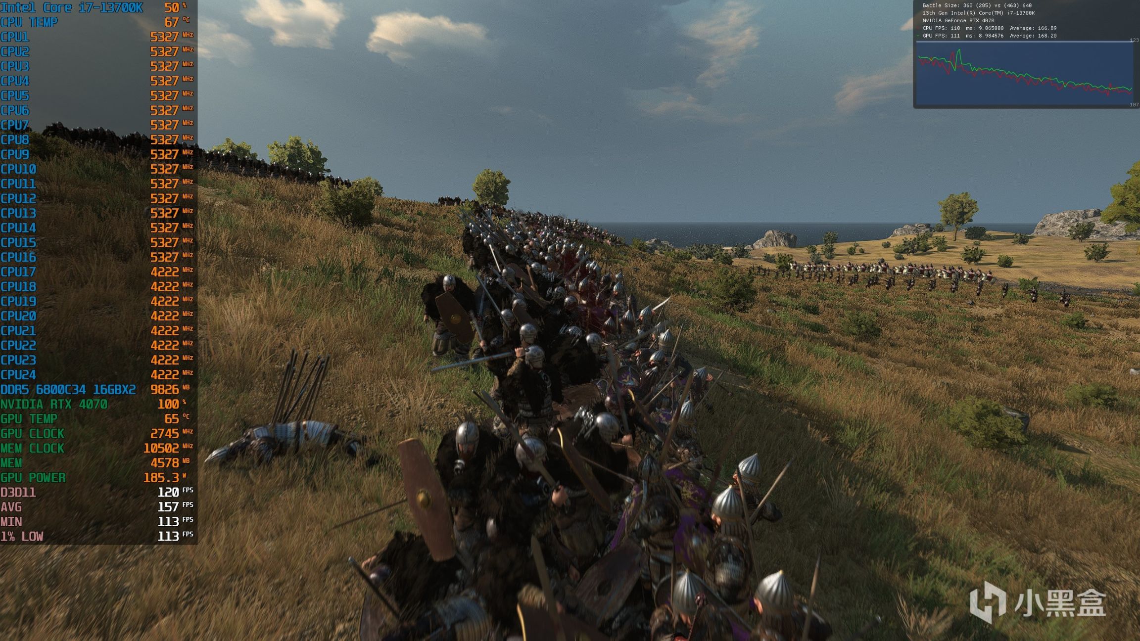 Core i7-13700K+RTX 4070+DDR5 6800C34运行《骑马与砍杀2》2K预设非常高画质平均帧数为157fps,CPU温度为67℃,显卡温度为65℃
