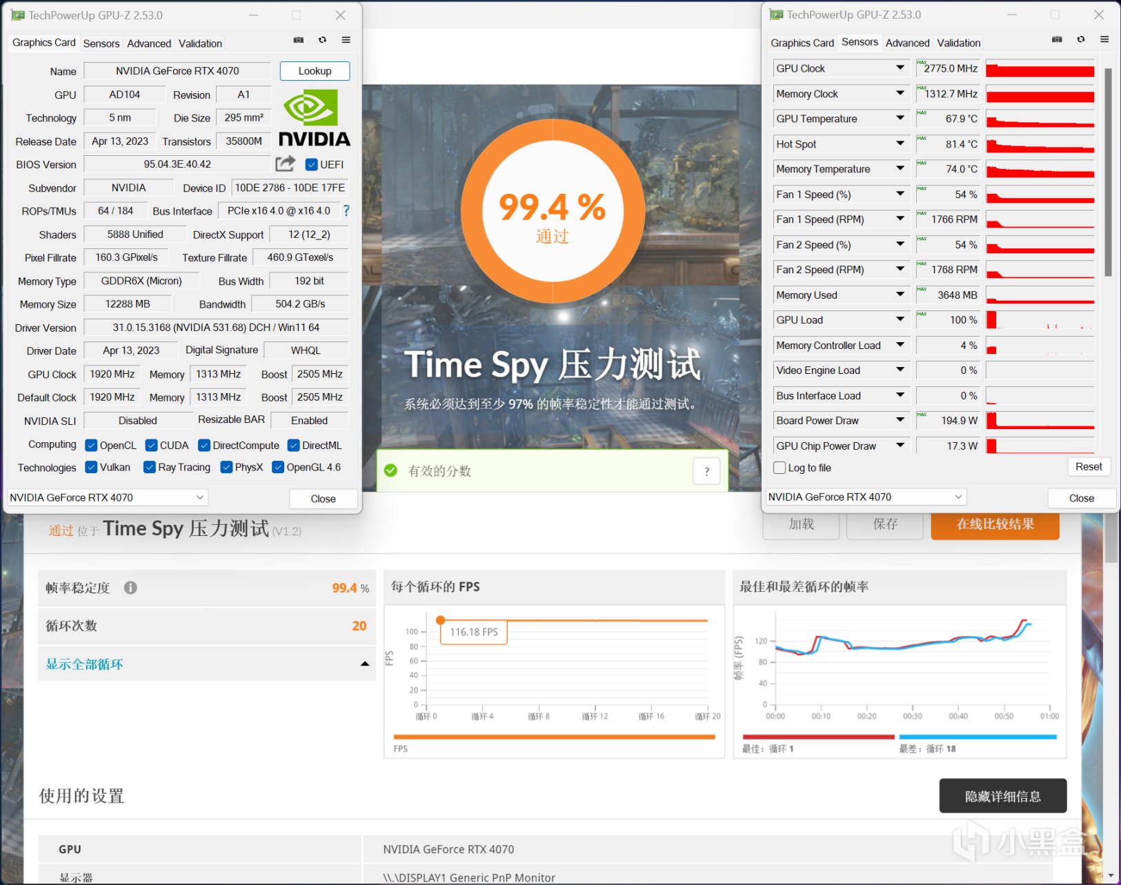 再跑下Time Spy压力测试看下显卡散热表现如何,最终通过率达到99.4%还挺稳定的,最高核心频率达到2775MHz,(室温20℃封箱状态)GPU核心温度最高是68℃,显存温度是74℃,风扇转速最高只有1768RPM基本没太大的噪声感知,200W功耗的RTX 4070压下来对于丐版也轻松,温度表现显然和其他高端非公也差不了多少的,请切记机箱底部的风扇有着关键作用!