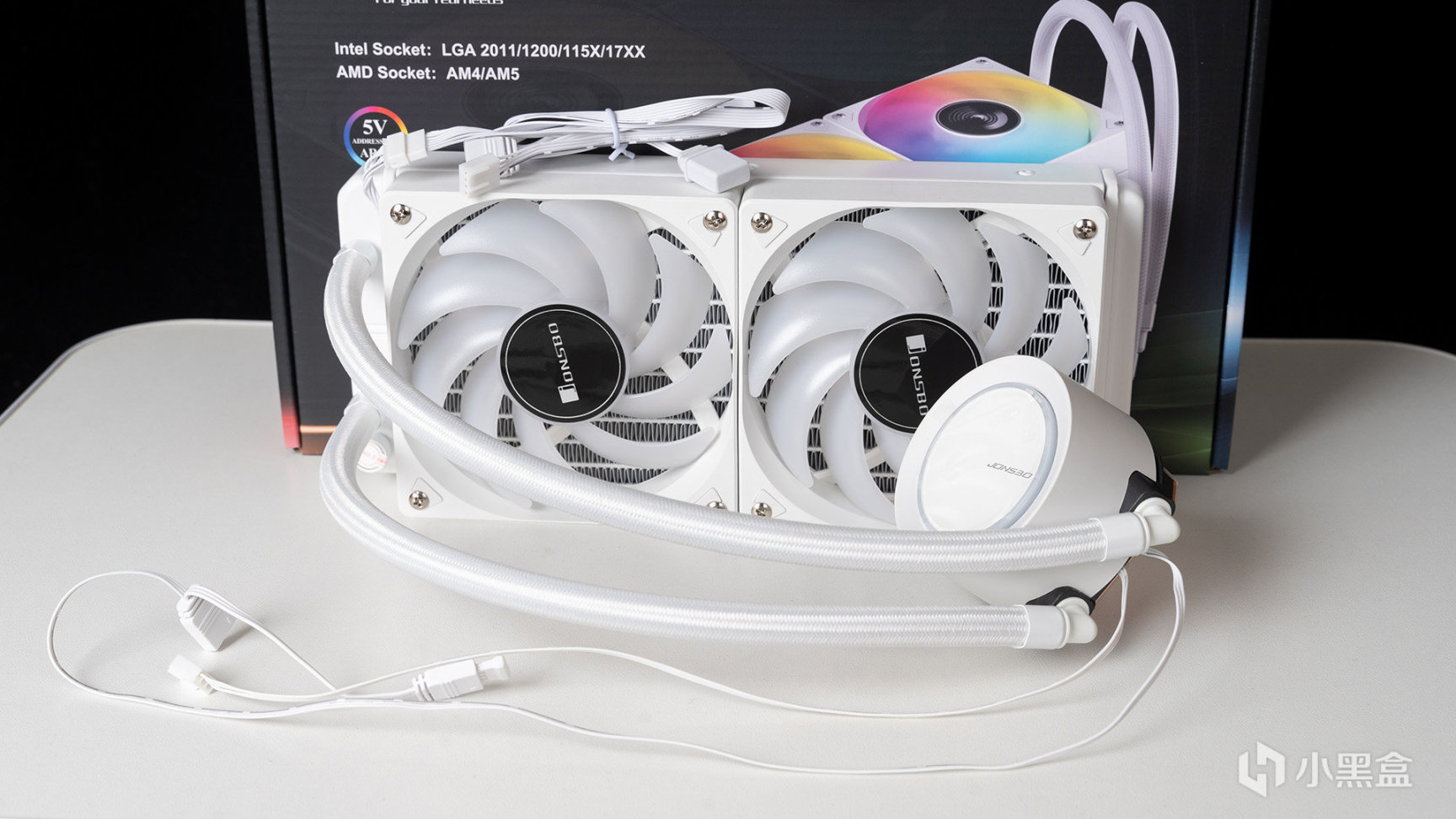 水冷风扇是出厂就预装在冷排上的,供电和ARGB线也已经接好,有两方面的好处:最大程度简化了安装流程,而且只需一根线连接主板机箱装起来就显得简洁。