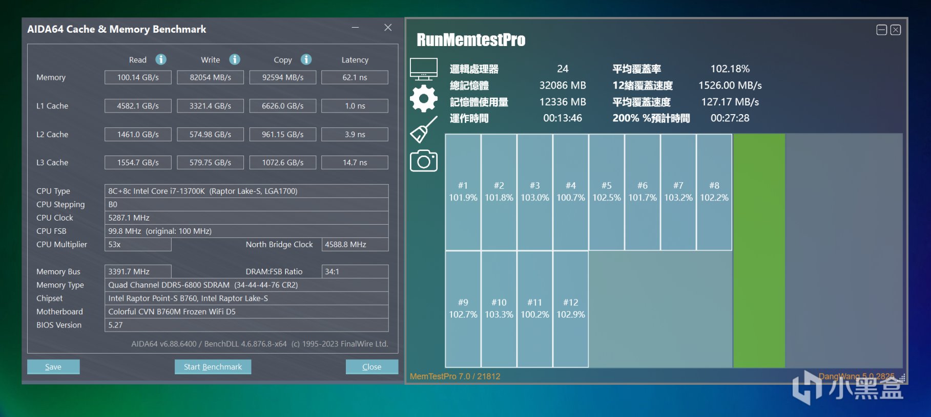 至于内存超频方面,七彩虹这款CVN B760M D5还是能给到一点惊喜的,经过一番调试,最终可把战斧·赤焰红白DDR5 6000超至DDR5 6800Mhz,时序需调整为34-44-44-76,这种状态下读取和复制性能都得到明显提升,当然因为时序局限写入方面出现轻微下降,而时序方面也有一点提升,也能通过RunMemtestPro 100%一轮烤机测试。