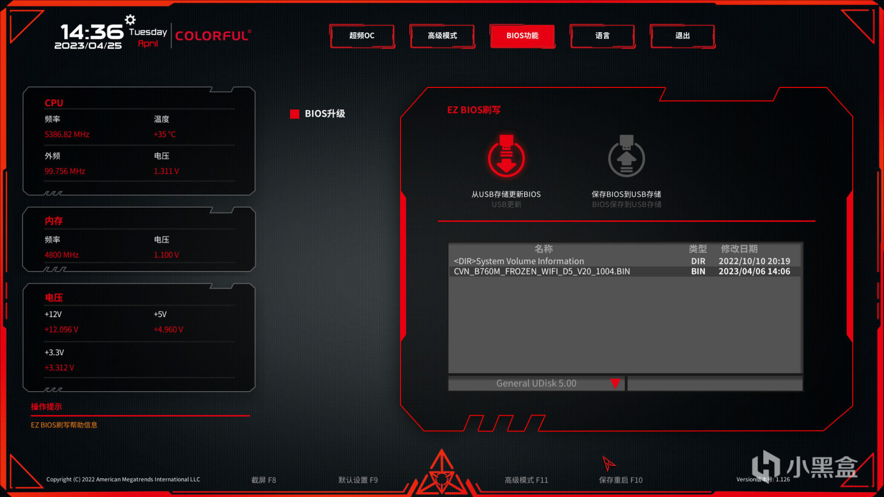 再把主板BIOS更新一下,说实话也挺方便的,进入主界面后会有独立的选项页面,直接可以选择USB设备读取文件即可,分为快速(不保留BIOS信息)或者完整两种方式进行,或者也可以利用主板的一键BIOS UPDATE按钮实现无CPU刷BIOS。