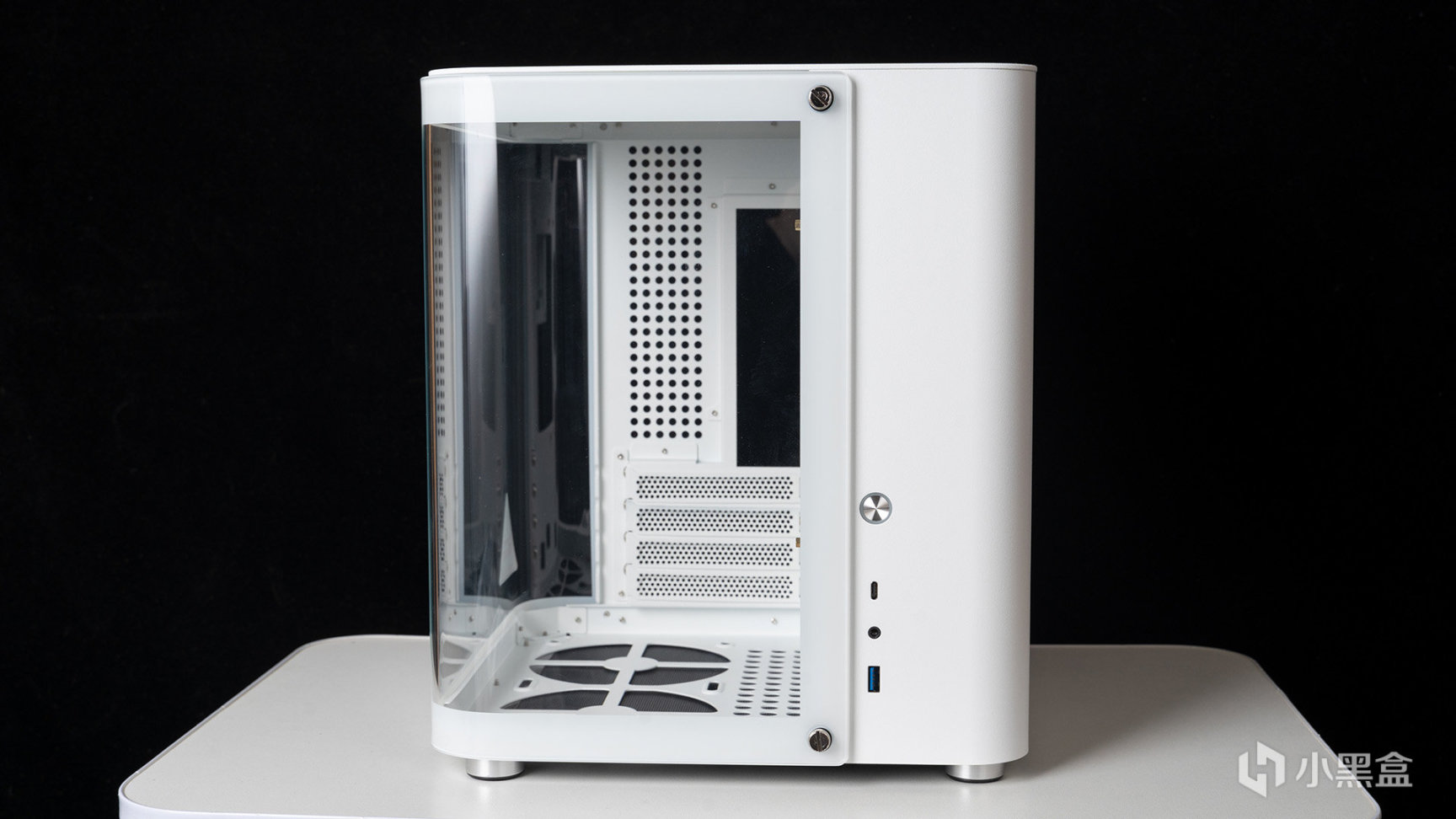 靠近I/O一侧的玻璃侧透覆盖面积也不小,这个角度摆放也能充分展示,而整块玻璃侧透由四个减震胶圈和螺丝固定,I/O接口是电源键、USB 3.2 Type-C、USB 3.0 Type A和耳机/音频的组合,USB接口数量感觉略少,要是再多给一组A口就完美了。