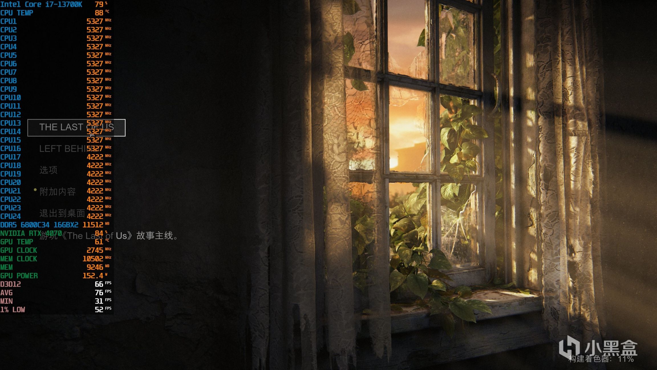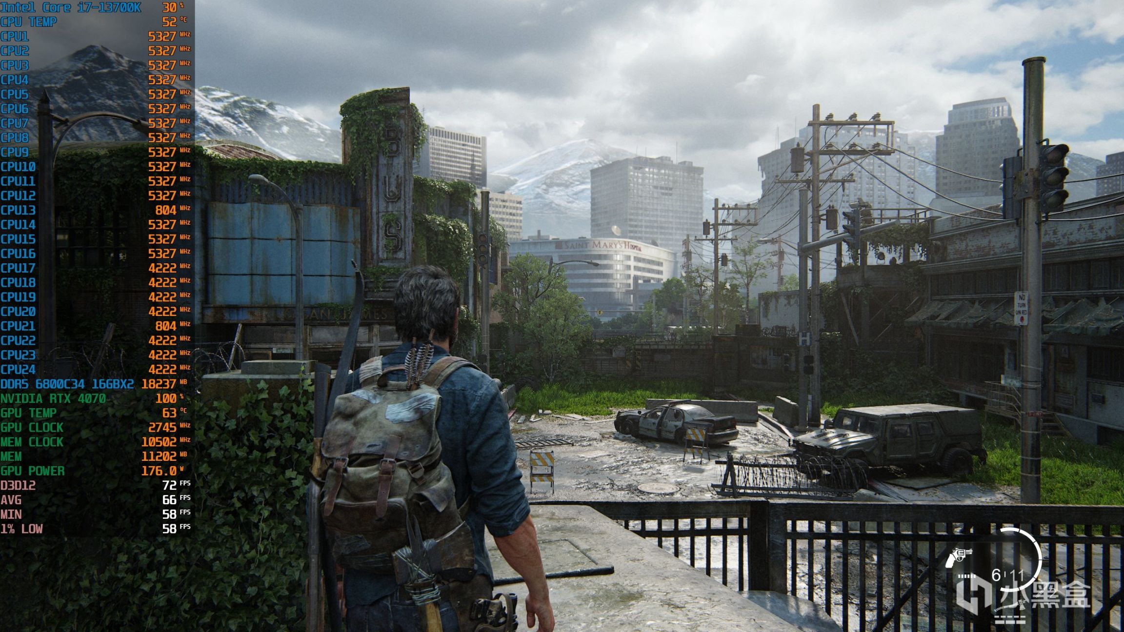 Core i7-13700K+RTX 4070+DDR5 6800C34运行《最后的生还者1:重制版》2K预设超高画质平均帧数为66fps,CPU温度为52℃,显卡温度为63℃