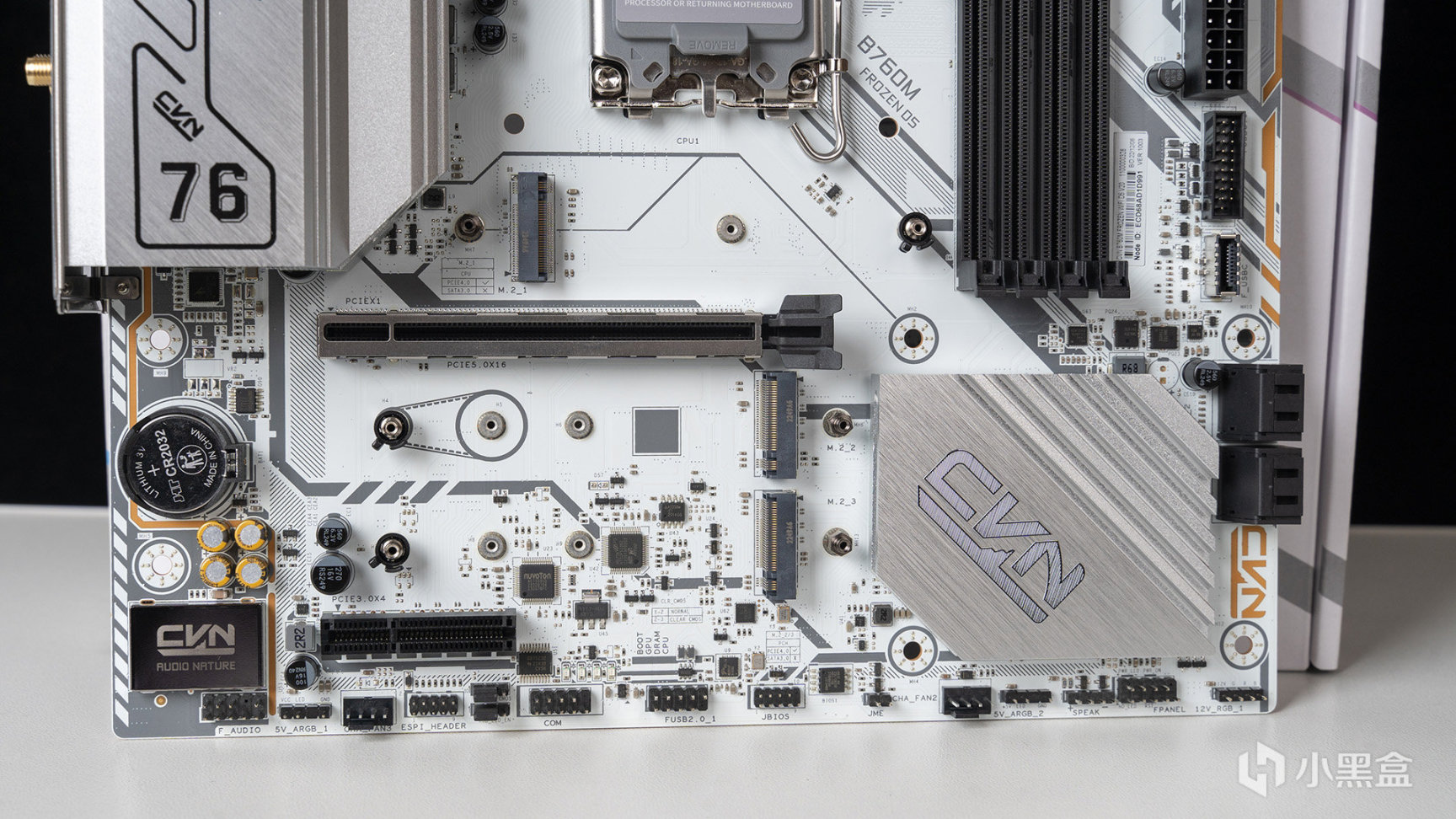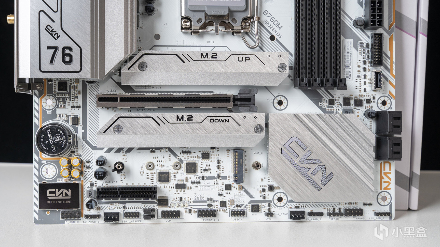 CVN B760M D5拥有一条金属强化加固的PCIe 5.0X16显卡插槽(直连CPU),还有一条PCIe 3.0X4插槽用于扩展其他硬件,除此之外这款主板最大的卖点之一就是拥有三组M.2插槽,均最高支持PCIe 4.0x4,这对于紧凑的M-ATX主板来说绝对很实用,类型的产品在市面上也比较罕见,唯一遗憾寒霜散热装甲只有两组,当然螺丝孔位是固定的,散热片可通用安装。