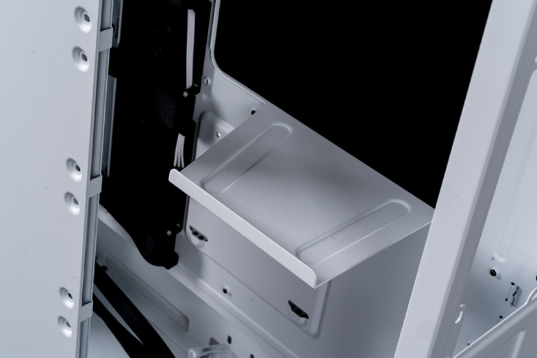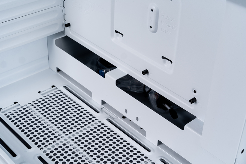 副仓的内部视角,左侧为风扇,中间的2.5硬盘支架的装饰刚好将理线槽挡住,右侧则是电源和硬盘仓,整体十分规整清爽。