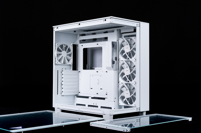 H9 Flow为左右分仓设计,顶部、主板右侧、底部均支持安装360冷排,最高支持165mm高度散热器,最长兼容435mm显卡,两侧的玻璃侧透面板均支持拆除,机箱尾部主板右侧默认安装四把120mm无光风扇。