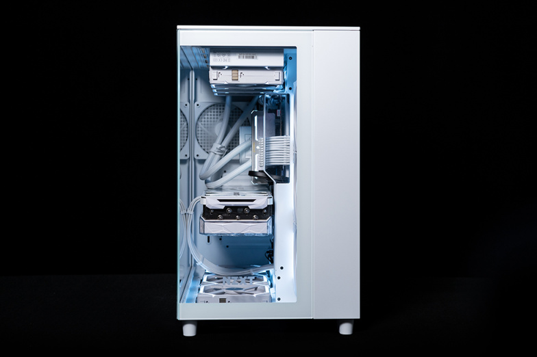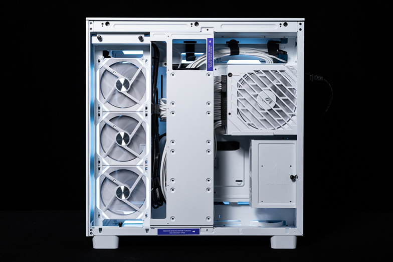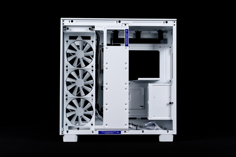 去掉侧板后的主仓正面视角,可以看到在装下ATX主板和3槽位的4080显卡后,上部360水冷,底部3个120风扇后,整体空间还是很富裕的,特别是底部的空间,对于喜欢玩分体水的玩家,在下面安装360冷排十分的轻松。