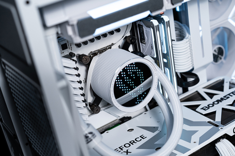散热器为ROG RYUO 龙王3代 360 AGRB 一体式水冷散热器,搭配第8代Asetek水泵解决方案、Anime Matrix™ LED 阵列显示屏,以及 ROG ARGB 冷排风扇。