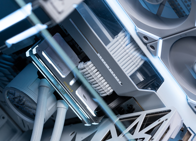 搭配RGB炫彩灯光和宝石设计风格的白色散热马甲,表面白色雾面磨砂工艺,顶部采用发丝纹铝合金装饰条包裹,错落叠加的设计呈现缀有宝石形状的镂空导光效果凸显浓郁电竞风格,支持主流厂商的主板灯效同步。