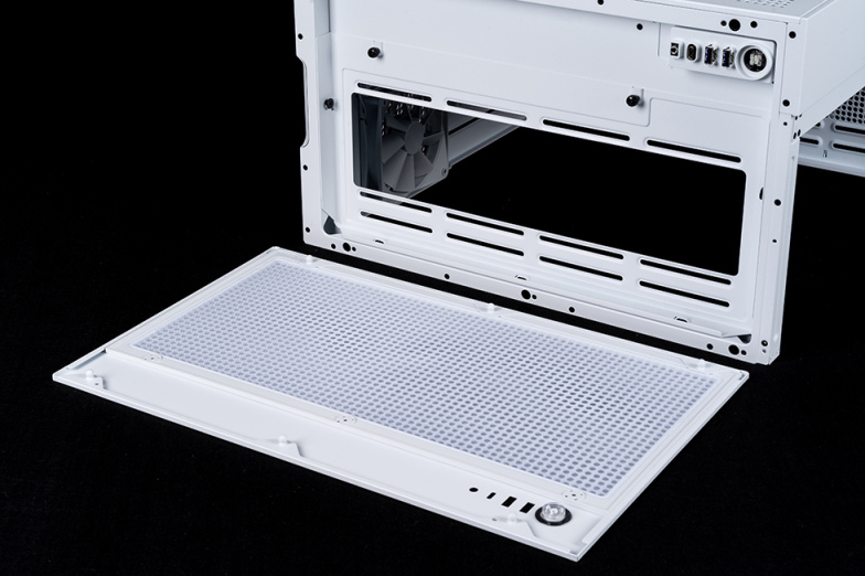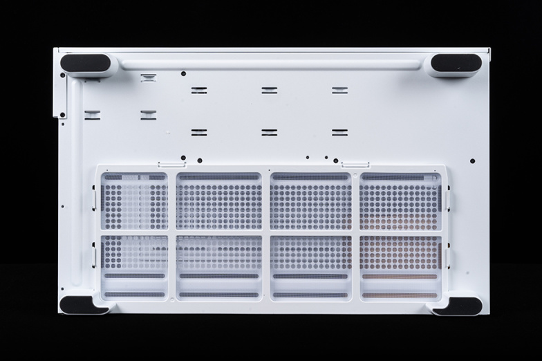 机箱底部配备了防滑脚垫,即使在玻璃桌面也具有极佳的防滑效果。底部位置是大面积的进风孔并配备可抽取式防尘网,内部可安装3个120mm或者2个240mm的散热风扇为显卡辅助散热。