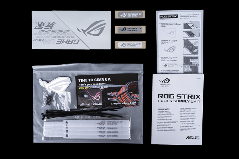 附件中除了说明书、cablemod优惠卡、绑带、螺丝以及白色的魔术贴扎带,还附赠了信仰满满的电源侧板磁贴和ROG“败家之眼”磁贴。