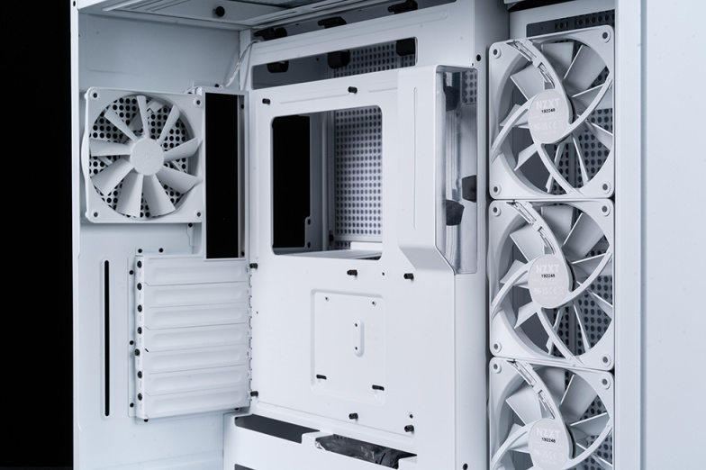 机箱内部,支持ATX、M-ATX及Mini-ATX主板,主板安装位置大面积镂空,便于散热器背板安装,主板位置右侧设计有理线挡板,配备七个PCIe槽位,可拆卸重复使用,支持竖装显卡(支架需要额外购买),上下两边都预留了充足的理线孔位。
