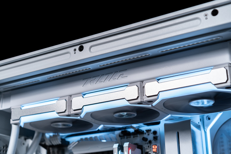 默认搭配ROG AF 12S ARGB 定制冷排风扇,兼顾气流穿透和风量风噪控制,扇叶为连体设计,2200 RPM下达到3.88H2O静压、70.07CFM流量、36.45dB(A)的噪音。