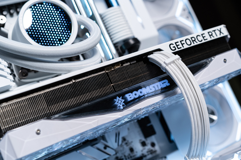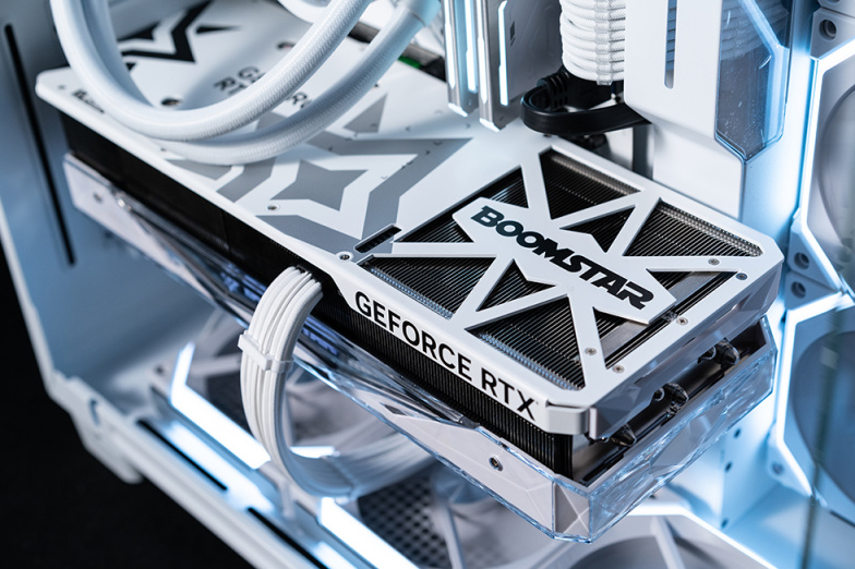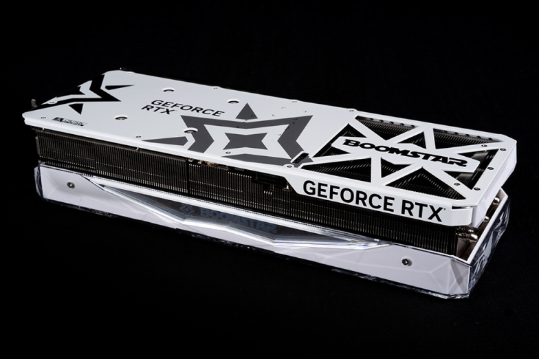 影驰GeForce RTX 4080 16GB 星曜 OC采用越肩设计,占用三个槽位,侧面导风槽上的BOOMSTAR logo采用千层镜光效,通电后有RGB效果。