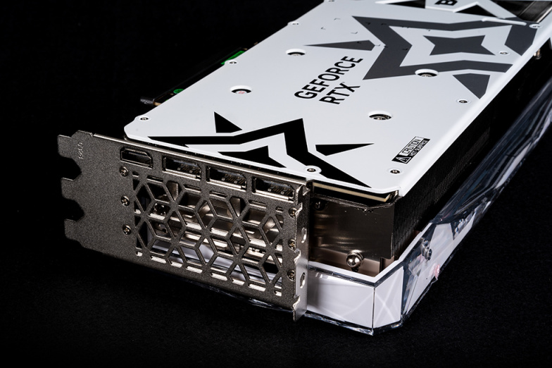 影驰 RTX 4080 16GB 星曜 OC采用全金属压铸白色背板,背板上有星型涂装,透过尾部位置大面积镂空。