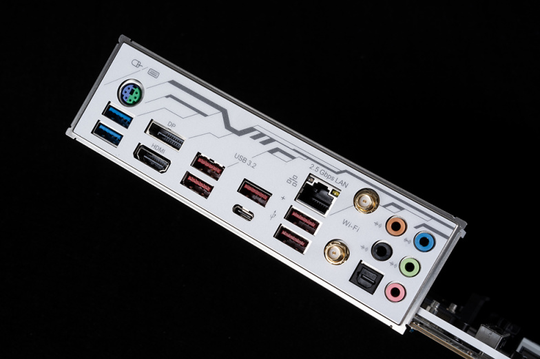 Z790 金属大师 D5 WI-FI 白金版采用了一体式IO背板设计,接口方面还是很丰富的,自上而下一次提供了2个USB 3.2 Gen1接口、1个PS/2接口键鼠接口、1个DP接口、1个HDMI接口、5个USB 3.2 Gen2接口、1个USB 3.2 Gen2 Type-C接口、1个2.5G网卡接口、S/PDIF光纤口和7.1声道音频。