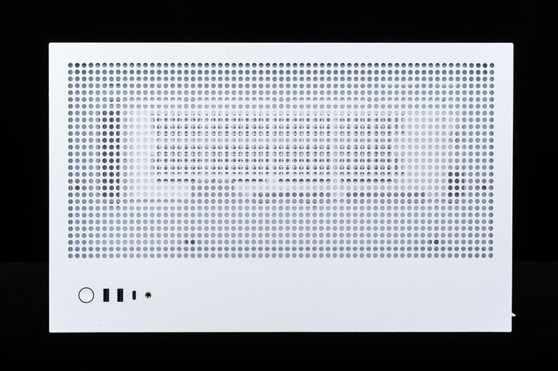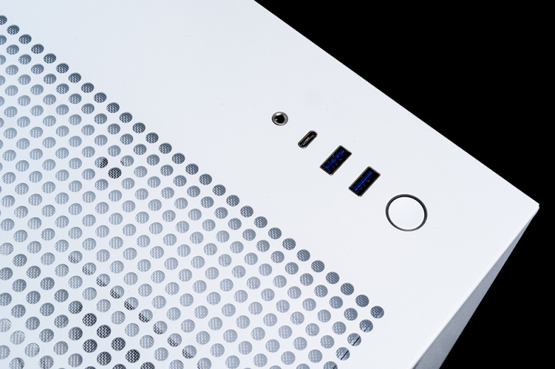 机箱顶部盖板和右侧的盖板采用同样的大面积镂空散热孔设计并附有防尘网。机箱的IO区域部署在顶部右前位置,依次为电源按键(通电后亮白色灯光)、两个USB3.2 Gen1 Type-A接口、一个USB 3.2 Gen2 Type-C和音频接口。